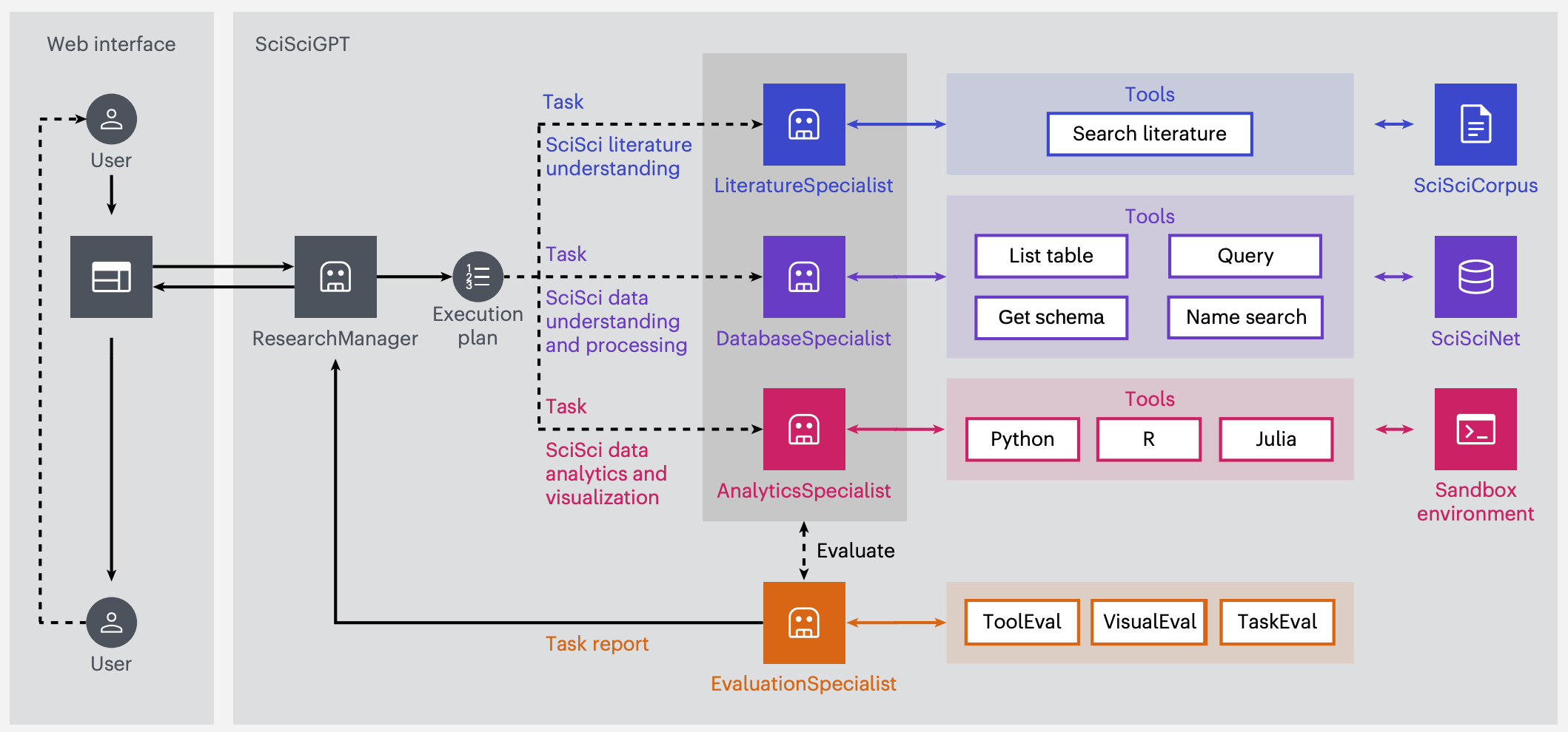 Multi-agent architecture: A ResearchManager agent delegates tasks to specialist agents for literature understanding, database processing, analytics, and evaluation through a web-based chat interface.