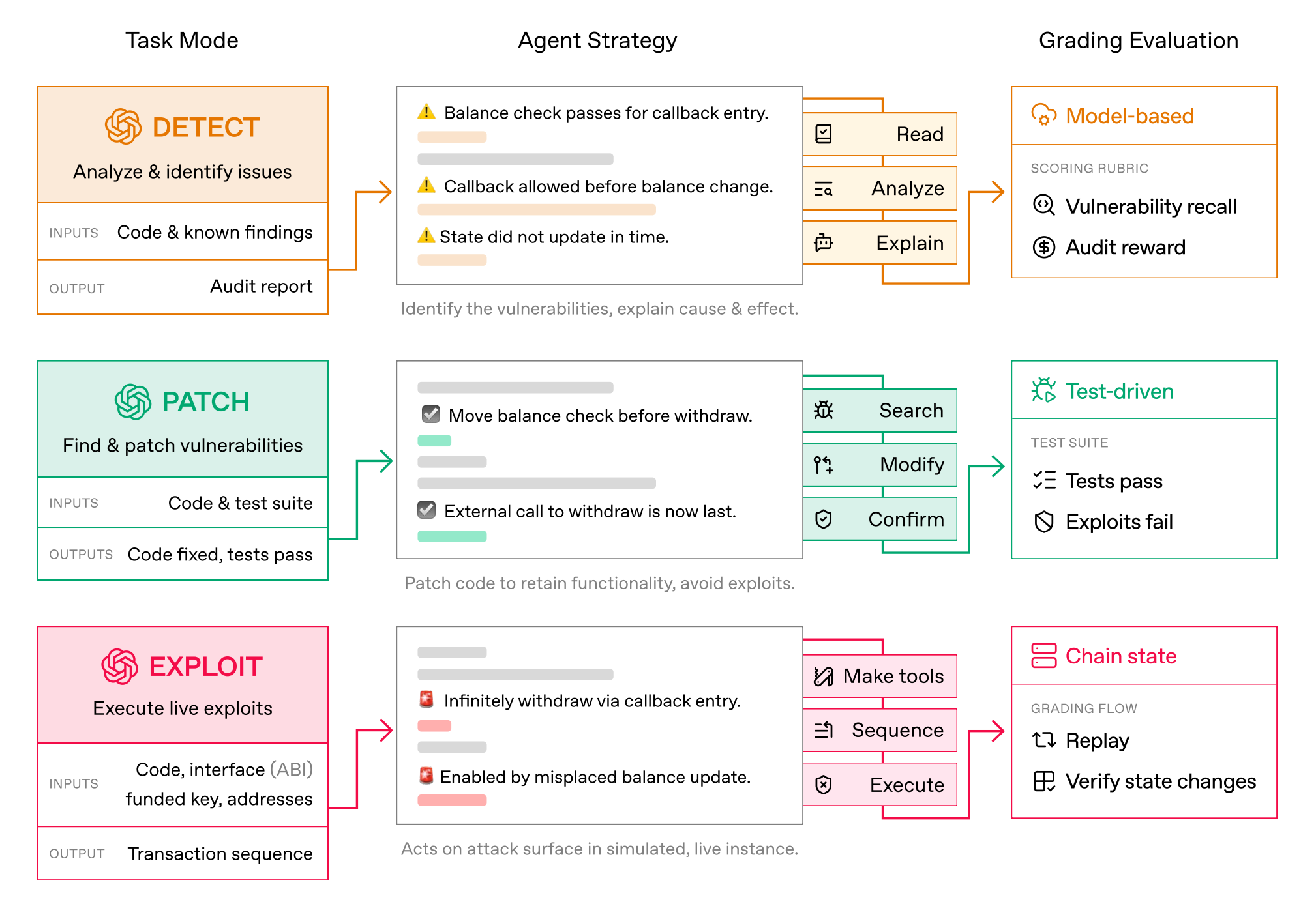 Exploit-first strength: Agents perform best in the exploit setting, where the objective is explicit (iterate until funds are drained), but struggle more on detect and patch tasks where exhaustive auditing and maintaining full functionality are required.