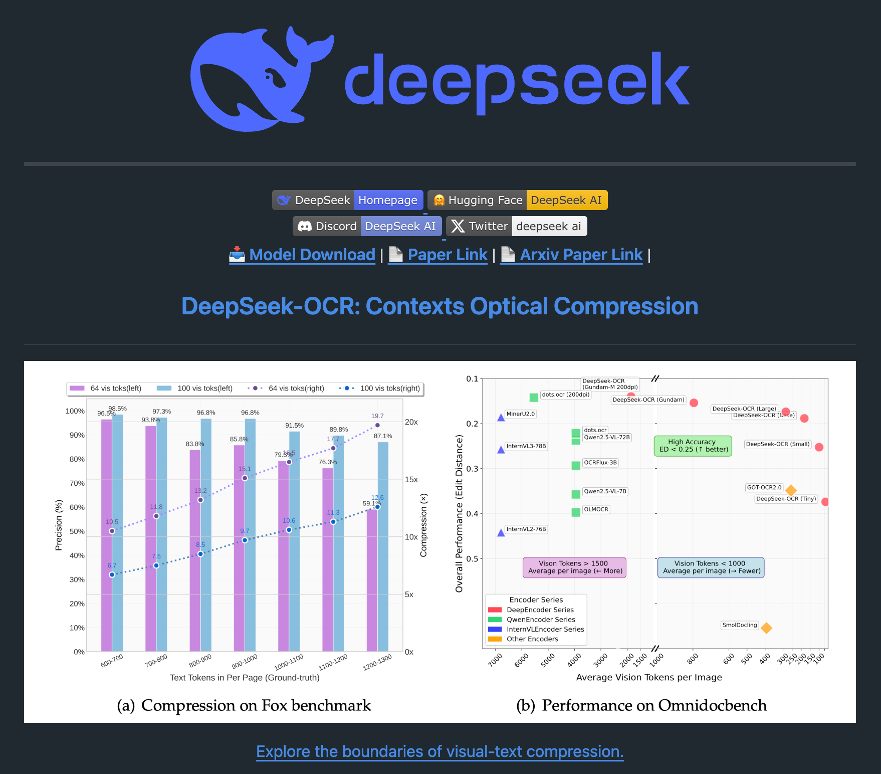 DeepSeek released DeepSeek-OCR, an open-source optical character recognition model focused on contextual optical compression that investigates vision encoder roles from an LLM-centric perspective. Available under MIT license, it enables efficient document and image text extraction with advanced visual understanding capabilities for both commercial and research applications.