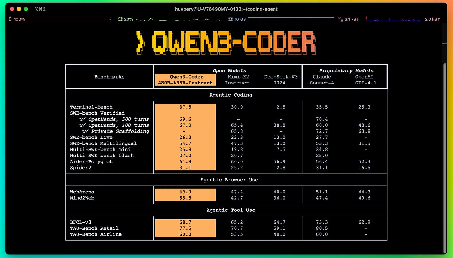 Qwen3-Coder is a new frontier in agentic code generation from the Qwen team, introduced as a 480B-parameter Mixture-of-Experts model with 35B active parameters. It supports a massive 256K-token native context window (up to 1M with extrapolation) and delivers state-of-the-art performance in agentic coding, browser use, and tool use, rivaling Claude Sonnet 4 among open models. Alongside the model, the team released Qwen Code, a command-line interface for agentic coding, and enabled integration with Claude Code.