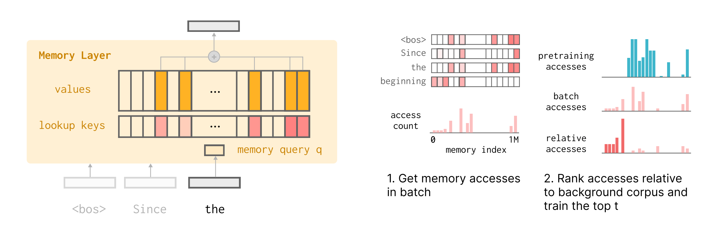 TF-IDF ranking for sparsity: Identifies memory slots specific to new input by computing term frequency-inverse document frequency scores relative to background corpus (pretraining data). Updates only top-t slots (e.g., 500 out of 1M) that are highly accessed on the new batch but infrequently used in general knowledge, minimizing interference.
