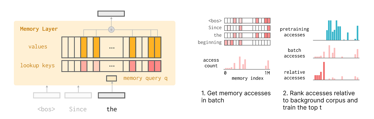 Memory layer architecture: Replaces feedforward layers with sparse parametric memory pools (1-10M slots) where each forward pass accesses only a small subset (e.g., 10k parameters). Provides balance between large overall capacity and minimal parameters per knowledge piece, enabling granular control over information storage.