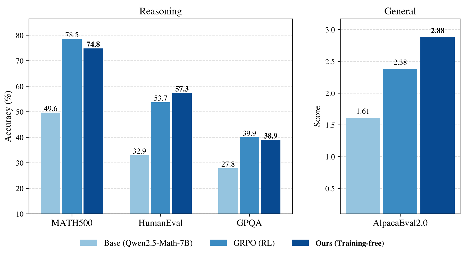 Training-free advantage: No hyperparameter sweeps, curated datasets, or reward verifiers required. Broadly applicable beyond verifiable domains. Samples from the highest base model likelihood/confidence regions (similar to GRPO) while maintaining 679-token average response length, suggesting latent reasoning capabilities exist in base models.
