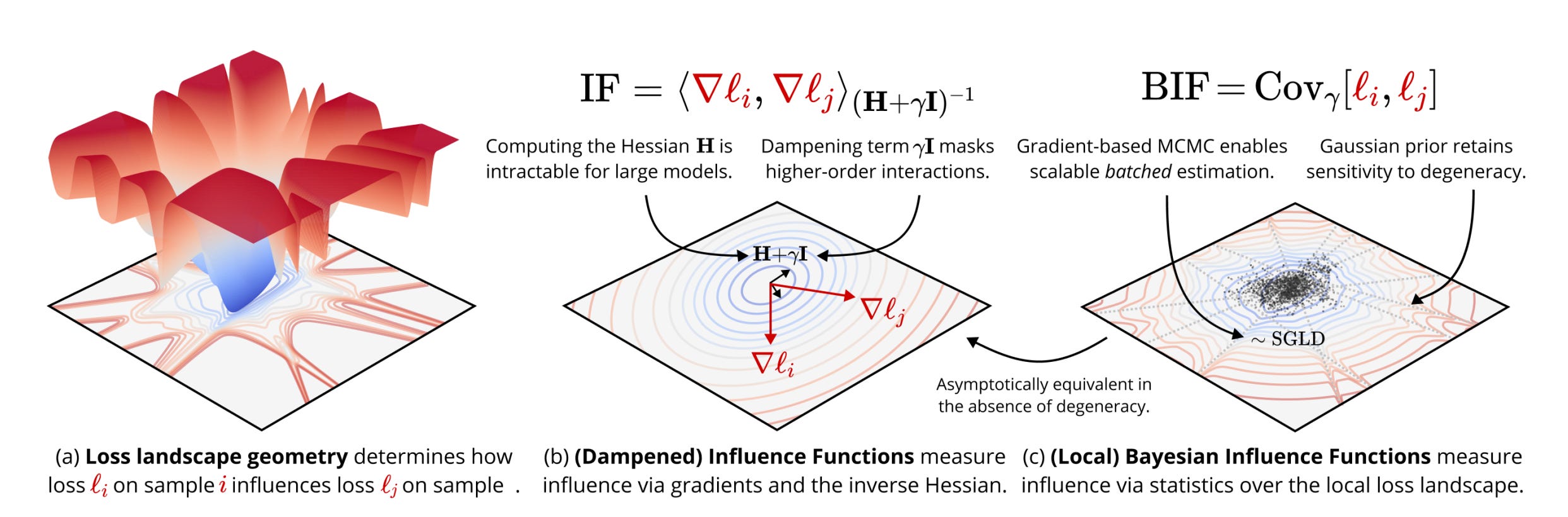 Classical influence functions struggle with deep neural networks due to non-invertible Hessians and high-dimensional parameter spaces. This work introduces the local Bayesian influence function (BIF), which replaces Hessian inversion with loss landscape statistics estimated via stochastic-gradient MCMC sampling.