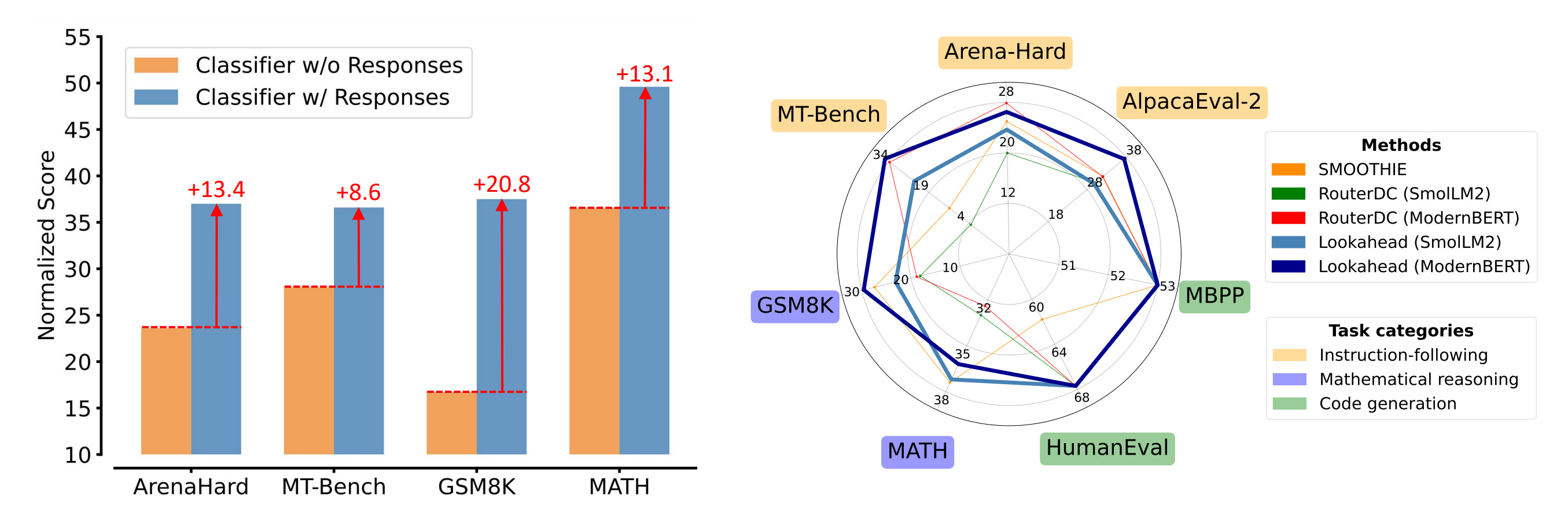 Performance: Achieves 7.7% average normalized score gain over SOTA RouterDC across 7 benchmarks (AlpacaEval-2, Arena-Hard, MT-Bench, GSM8K, MATH, HumanEval, MBPP). MLM variant excels on open-ended instruction-following tasks where joint semantic-space encoding enables fine-grained cross-model comparisons. Routes nearly 100% of code queries to the specialized Qwen2.5-Coder model, demonstrating strong specialization awareness.