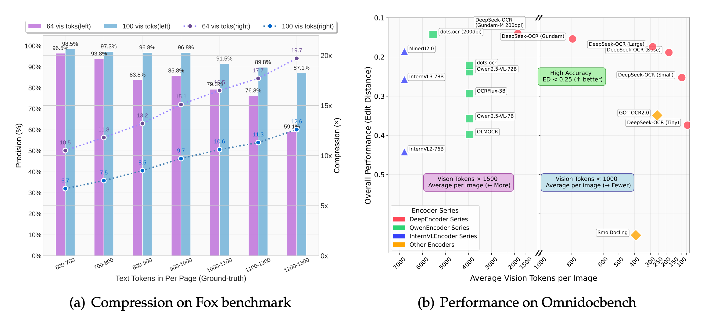 Production-ready performance: Surpasses GOT-OCR2.0 using only 100 vision tokens vs 256, outperforms MinerU2.0 (6000+ tokens/page) with under 800 tokens. Processes 200k+ pages/day on a single A100-40G GPU. Achieves SOTA on OmniDocBench among end-to-end models with the fewest vision tokens.