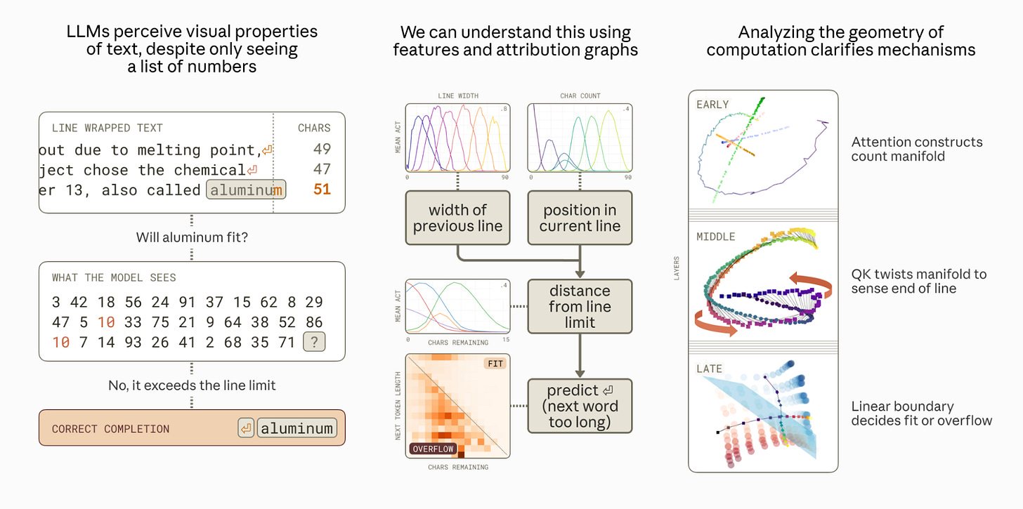 Anthropic researchers investigate how Claude 3.5 Haiku learns to predict line breaks in fixed-width text, revealing geometric representations analogous to biological place cells and boundary cells in biological brains.