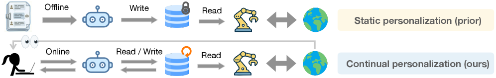 Continual learning through interaction: Unlike static fine-tuning approaches, PAHF enables agents to learn from live interactions. The explicit memory store allows agents to accumulate and revise user preference profiles without retraining, making personalization practical for production deployments.