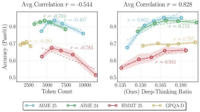 Google researchers challenge the assumption that longer outputs indicate better reasoning. They introduce deep-thinking tokens, a metric that identifies tokens where internal model predictions shift significantly across layers before stabilizing. Unlike raw token count, which negatively correlates with accuracy (r = -0.59), the deep-thinking ratio shows a robust positive correlation (r = 0.683).