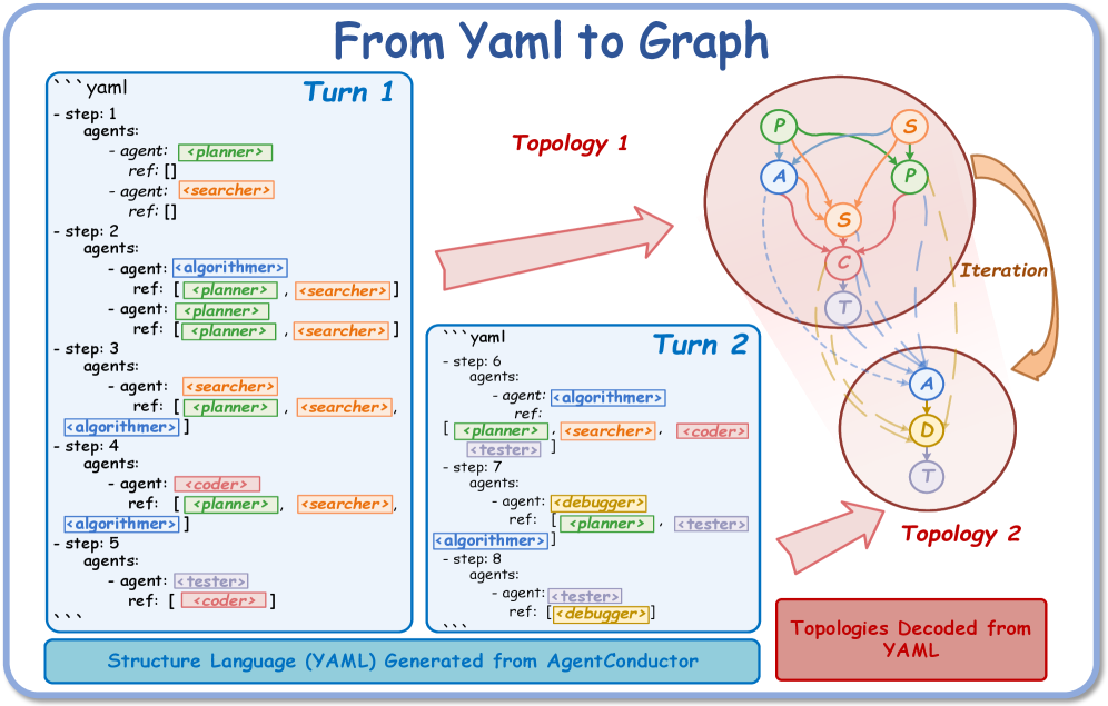 Task-adapted topologies: The orchestrator constructs density-aware layered directed acyclic graph (DAG) topologies tailored to problem difficulty. Simple problems get sparse topologies with minimal communication overhead, while complex problems get denser multi-agent collaboration.