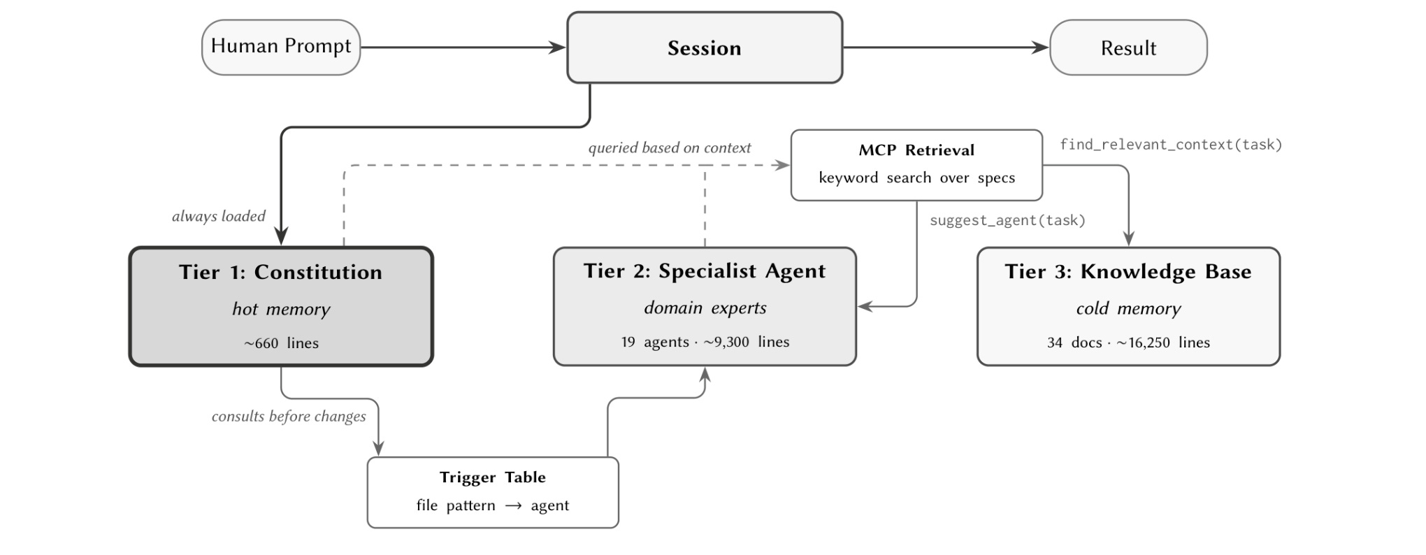 Hot-memory constitution: A living document encoding conventions, retrieval hooks, and orchestration protocols that the agent consults at the start of every session. This provides immediate awareness of project standards without requiring the agent to rediscover them through exploration.