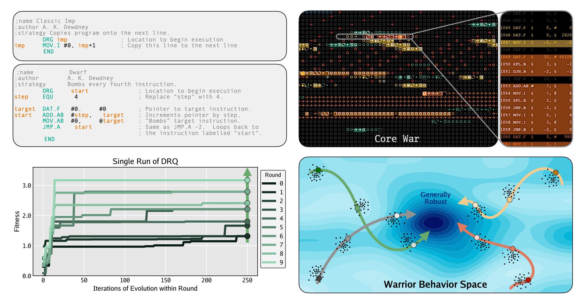 Digital Red Queen (DRQ) introduces an algorithm where LLMs evolve assembly-like programs called âwarriorsâ that compete for control of a virtual machine in the game of Core War. Rather than optimizing toward static objectives, DRQ embraces âRed Queenâ dynamics where goals continually shift based on competition, demonstrating how adversarial self-play can drive the evolution of increasingly sophisticated programs.