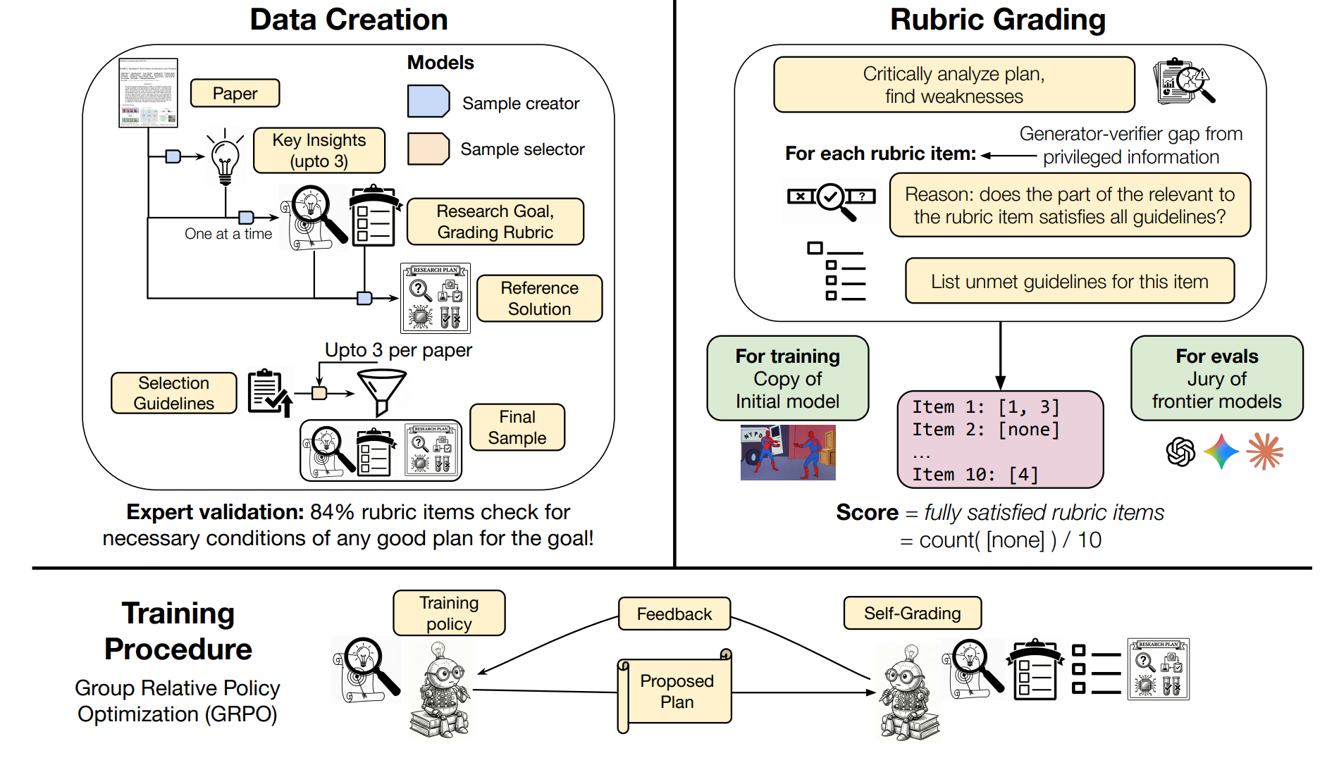 This paper from Meta Superintelligence Labs presents a scalable method to train language models to generate better research plans without expensive human supervision or real-world execution. The approach automatically extracts research goals and goal-specific grading rubrics from scientific papers, then uses reinforcement learning with self-grading to improve plan generation.