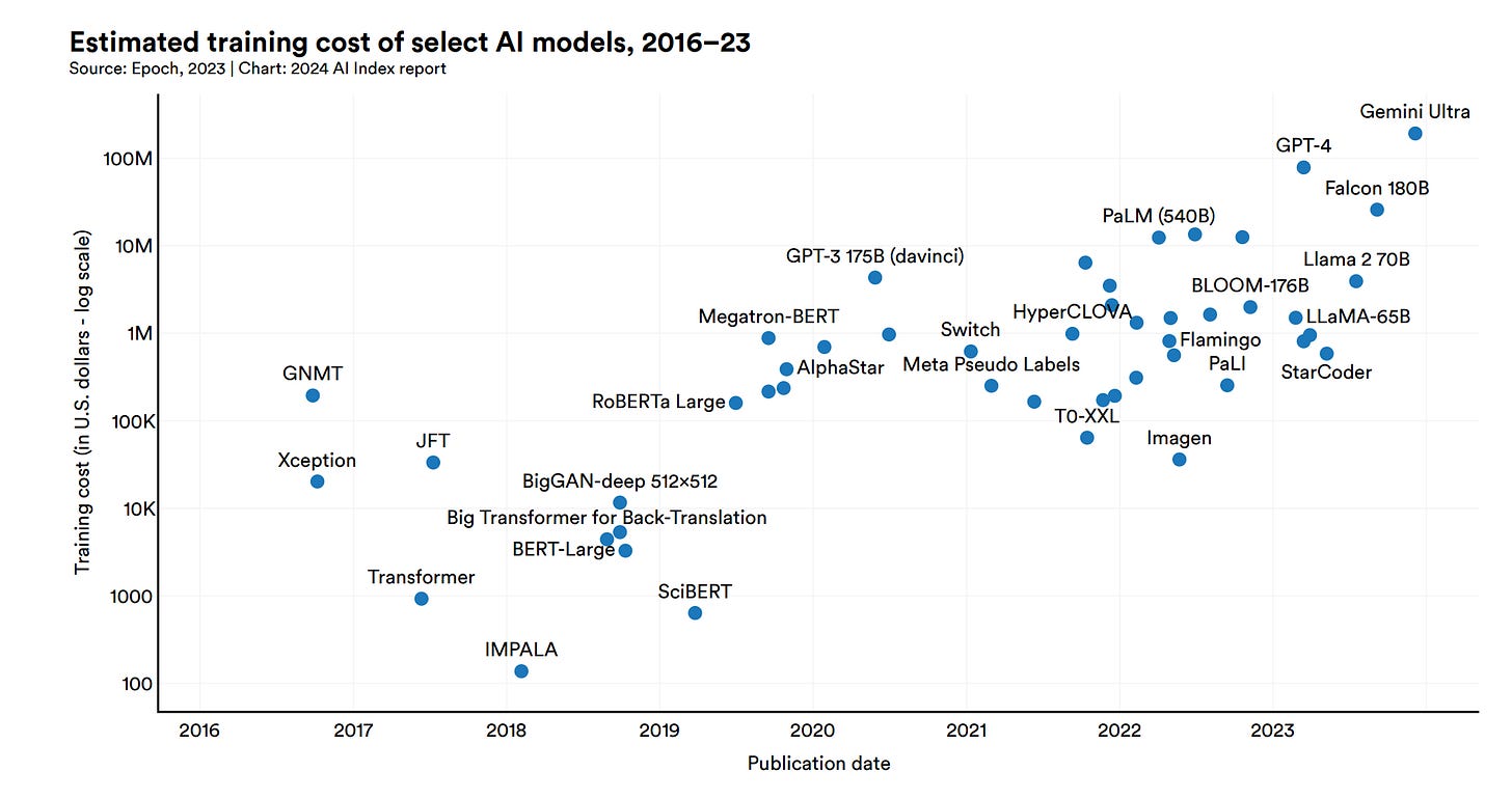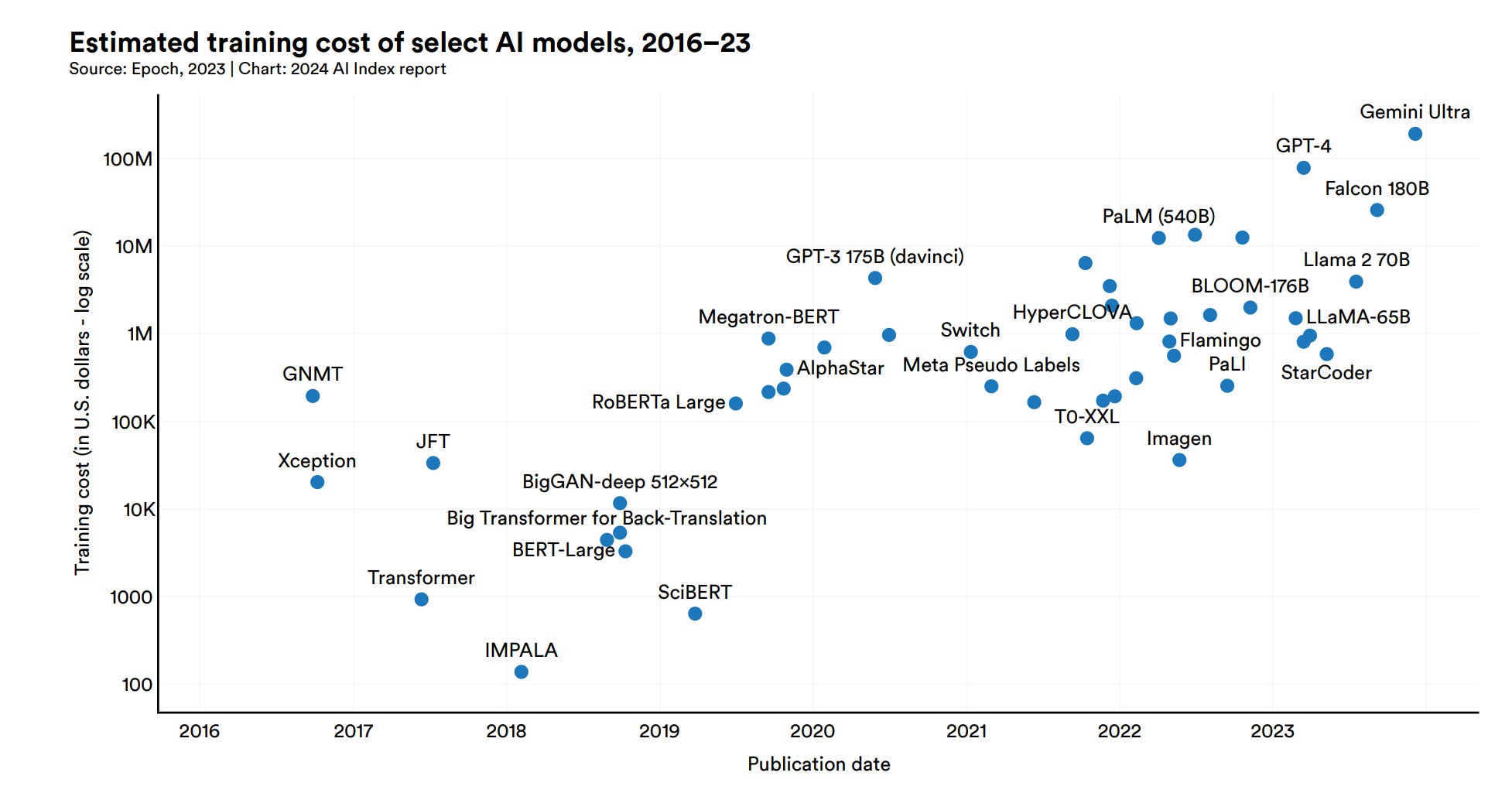 Algorithmic improvements matter more: Progress has been driven by instruction finetuning, model distillation, chain-of-thought reasoning, preference training, and retrieval augmented generation - techniques that add little training compute but yield significant performance gains.