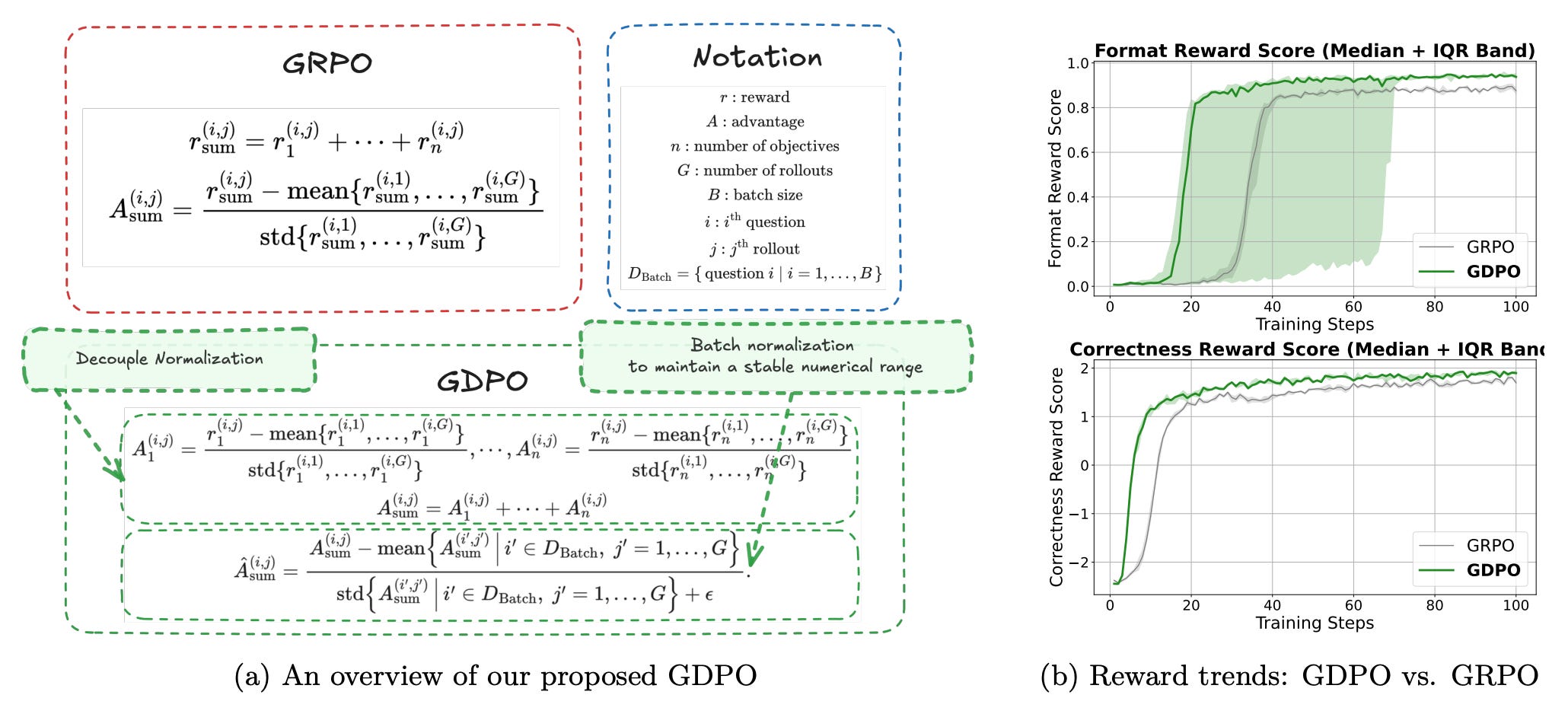 Decoupled normalization: GDPO decouples the normalization of individual rewards, more faithfully preserving their relative differences and enabling more accurate multi-reward optimization across competing objectives.