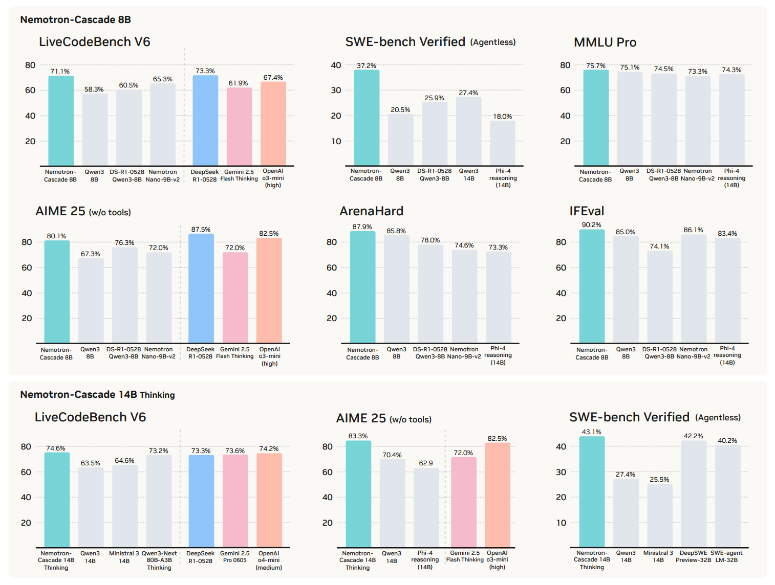 Nemotron-Cascade introduces cascaded domain-wise reinforcement learning (Cascade RL) to build general-purpose reasoning models capable of operating in both instruct and deep thinking modes. Rather than blending heterogeneous prompts from different domains, Cascade RL orchestrates sequential, domain-wise RL stages that reduce engineering complexity while delivering state-of-the-art performance.