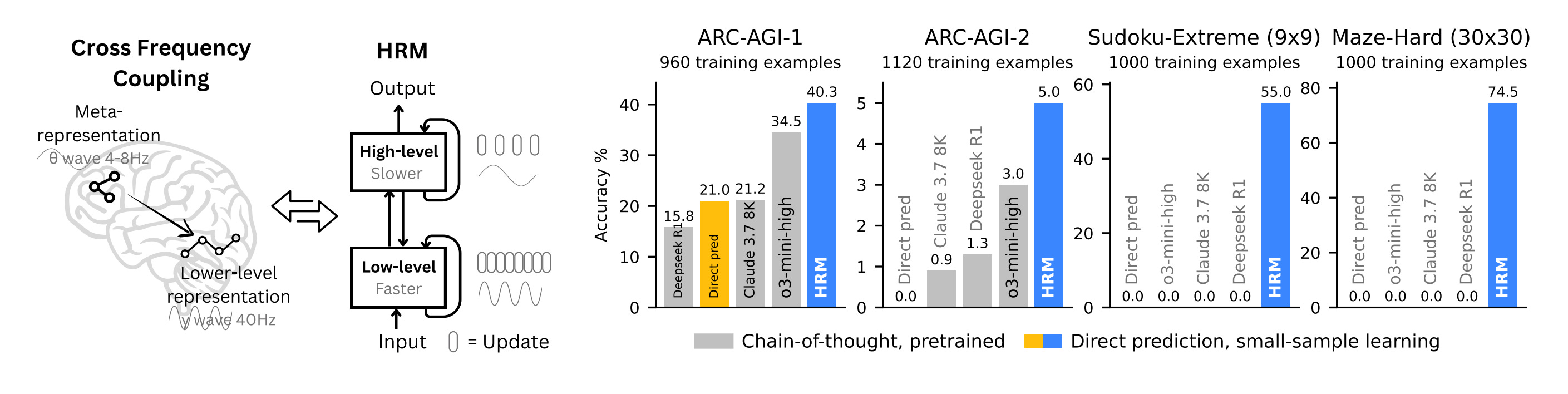 Hierarchical Reasoning Model (HRM) is a novel, brain-inspired architecture that replaces CoT prompting with a recurrent model designed for deep, latent computation. It departs from token-level reasoning by using two coupled modules: a slow, high-level planner and a fast, low-level executor, achieving greater reasoning depth and efficiency with only 27M parameters and no pretraining. Despite its small size and minimal training data (~1k examples), HRM solves complex tasks like ARC, Sudoku-Extreme, and 30Ć30 maze navigation, where CoT-based LLMs fail.