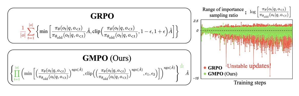 Introduces a stabilized alternative to Group Relative Policy Optimization (GRPO), which is widely used to improve reasoning capabilities in large language models via reinforcement learning. GRPO optimizes the arithmetic mean of token-level rewards but suffers from training instability due to extreme importance sampling ratios. GMPO addresses this by instead maximizing the geometric mean of token-level rewards, leading to more stable updates.