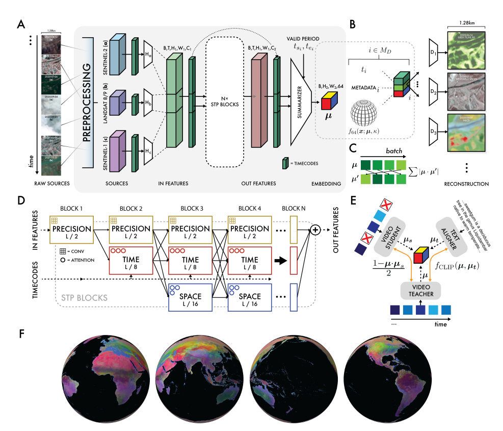 AEF combines over 3 billion observations from 10 geospatial data sources, including Sentinel-1/2, Landsat, GEDI, GRACE, and Wikipedia, to generate 64-byte embeddings via a temporal bottleneck architecture. It supports continuous-time modeling with time-conditional summarization and decoding, including for previously unseen time intervals.