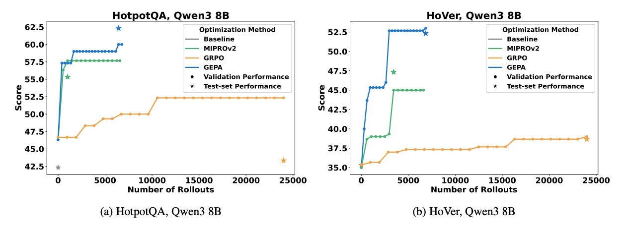 Across four benchmarks, HotpotQA, IFBench, PUPA, and HoVer, GEPA outperforms the strong RL baseline GRPO by up to 20% and requires up to 35Ć fewer rollouts. It also surpasses the previous state-of-the-art prompt optimizer MIPROv2 by 10ā14%, while producing shorter, more efficient prompts that generalize better across tasks and models.
