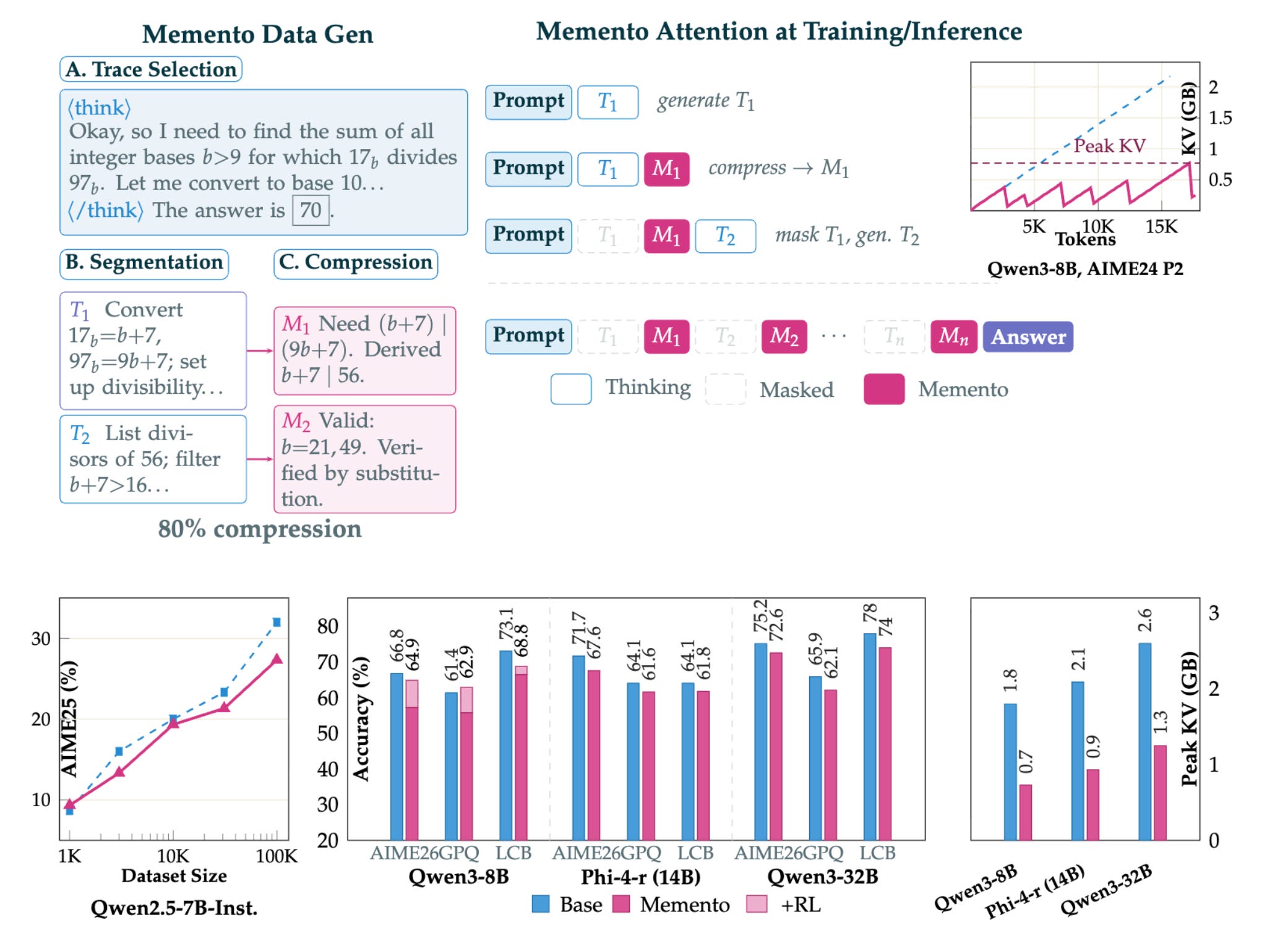 New research from Microsoft teaches reasoning models to compress their own chain-of-thought mid-generation. Memento trains models to segment reasoning into blocks, summarize each block into a compact āmemento,ā and then evict the original block from the KV cache. The model continues reasoning from mementos alone, cutting peak memory by 2-3x while nearly doubling throughput.