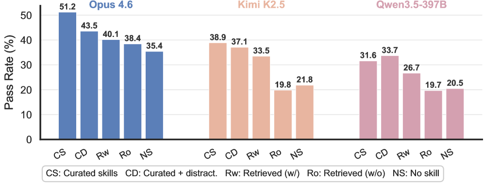 Retrieval as the bottleneck: The core failure mode is not skill execution but skill selection. When agents must identify the right skill from a massive library, the retrieval step introduces errors that cascade through execution, highlighting a fundamental gap between demo-ready and production-ready skill systems.