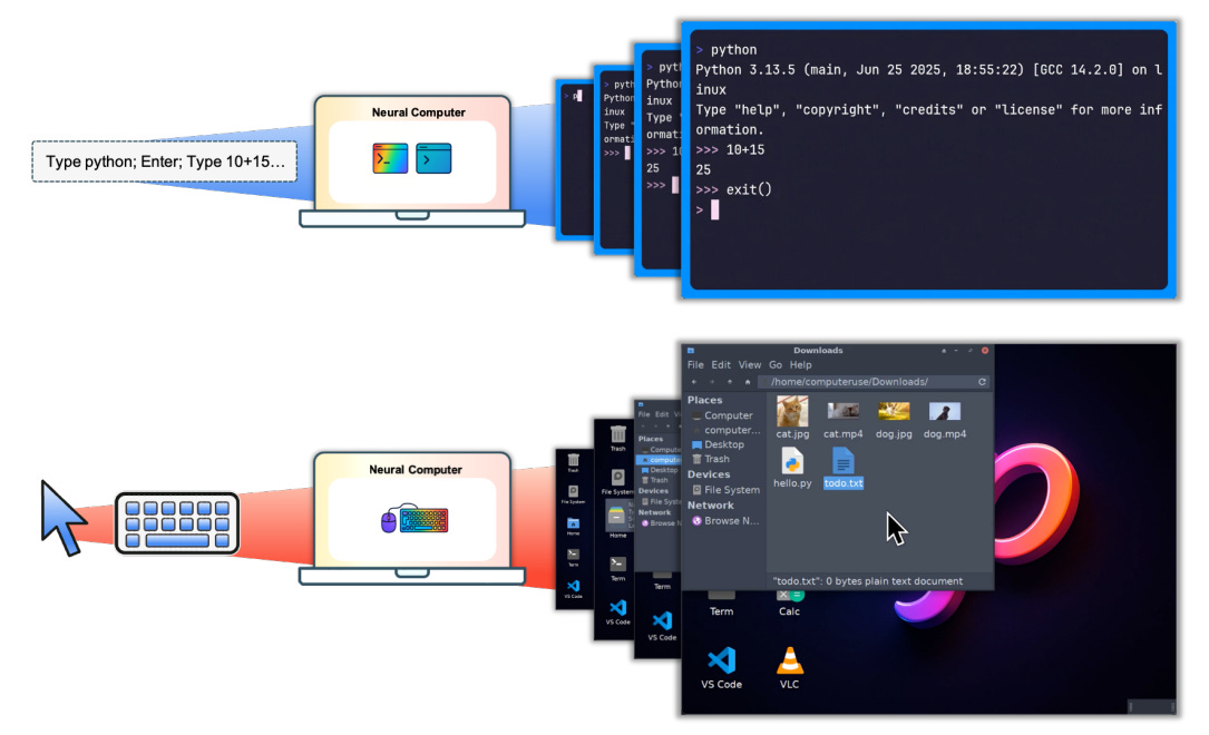 Video models as prototype substrate: The team instantiates NCs as video models that generate screen frames from instructions, pixel inputs, and user actions. Two prototypes cover command-line interfaces (NCCLIGen, which renders and executes terminal workflows) and graphical desktops (NCGUIWorld, which learns pointer dynamics and menu interactions), both trained without access to internal program state.