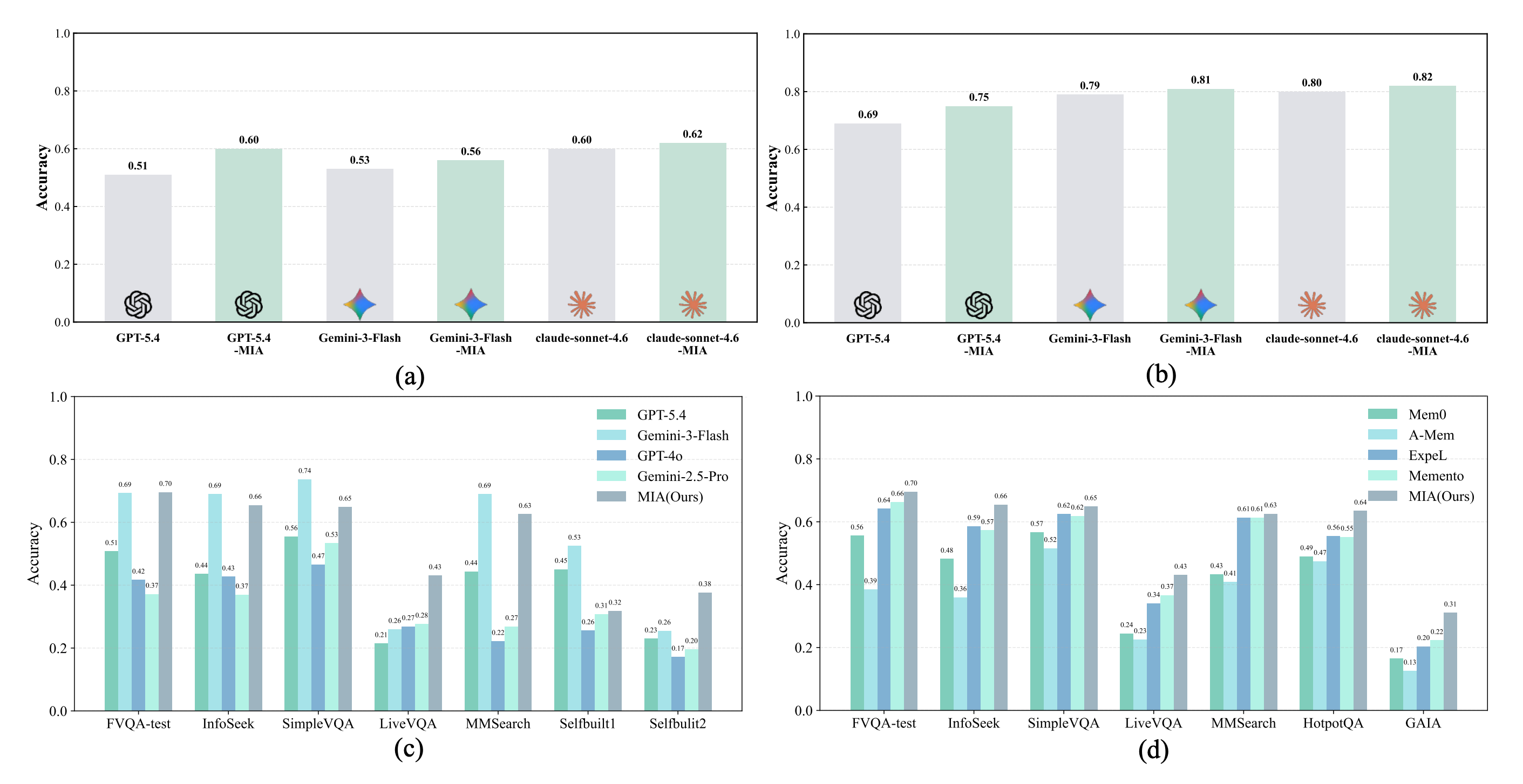 Most memory-augmented research agents treat memory as a static retrieval store, leading to inefficient evolution and rising storage costs. MIA introduces a Manager-Planner-Executor architecture where a Memory Manager maintains compressed search trajectories, a Planner generates strategies, and an Executor searches and analyzes information. The framework boosts GPT-5.4 by up to 9% on LiveVQA through bidirectional memory conversion.