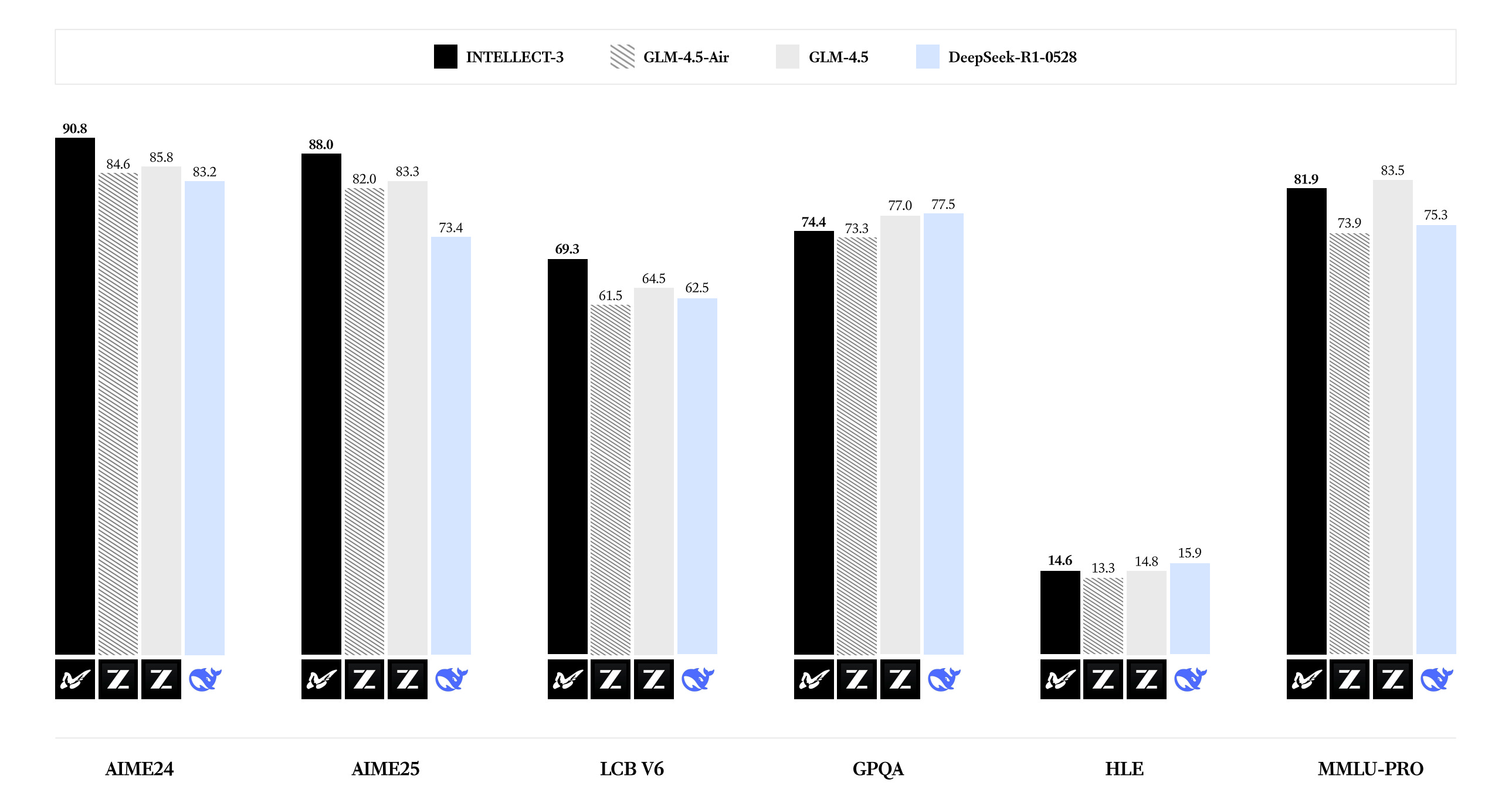 INTELLECT-3 is a 106B-parameter Mixture-of-Experts model (12B active) trained with large-scale reinforcement learning, achieving state-of-the-art performance for its size across math, code, science, and reasoning benchmarks. Built on top of GLM-4.5-Air base, it outperforms many larger frontier models, including DeepSeek R1-0528, and matches GLM-4.6 (which has over 3x the parameters) on key benchmarks.