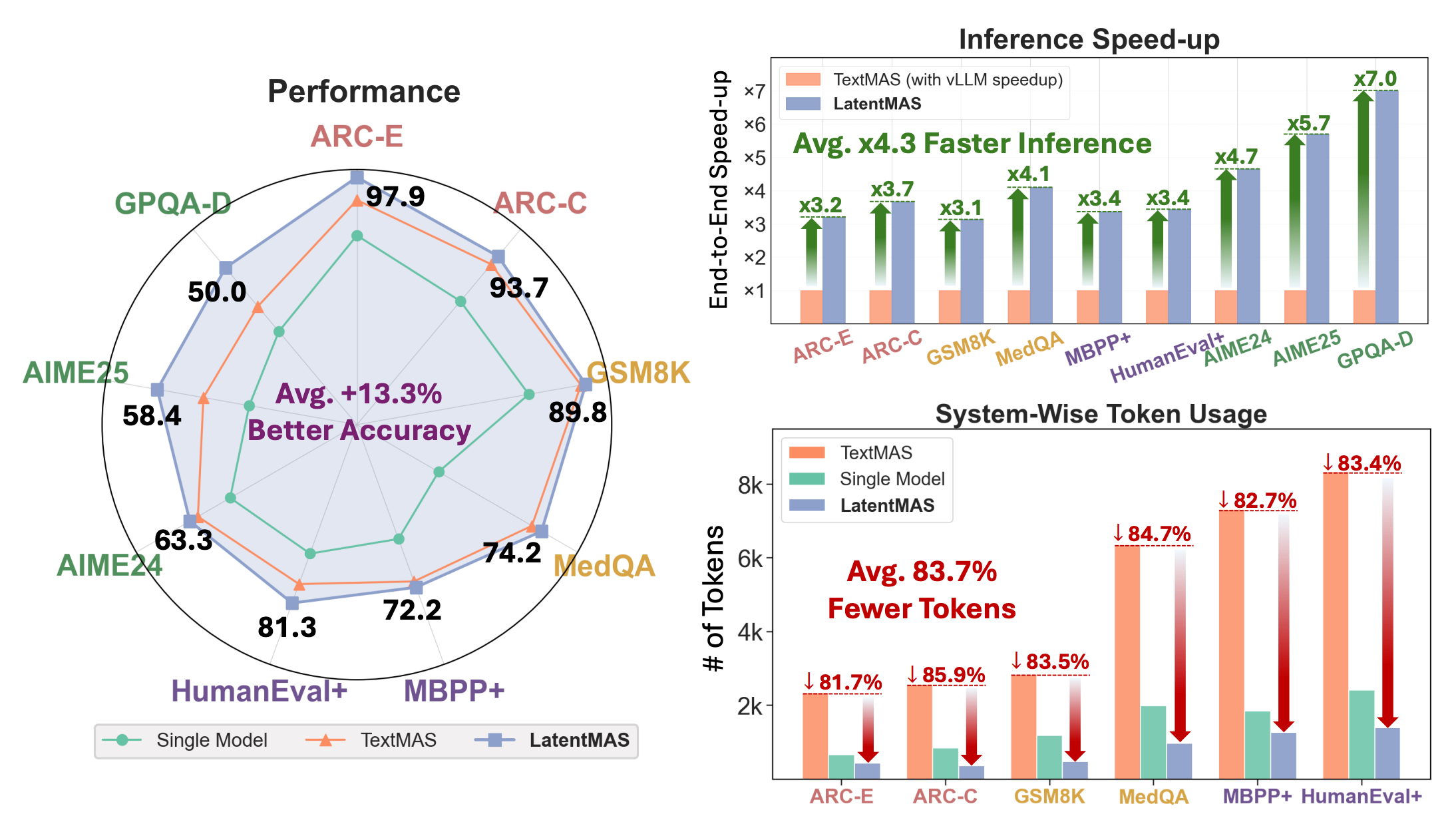 Substantial efficiency gains: Achieves 70.8-83.7% reduction in output token usage and 4x-4.3x faster end-to-end inference speed compared to text-based multi-agent approaches. The latent communication eliminates redundant encoding and decoding cycles that dominate traditional agent collaboration.