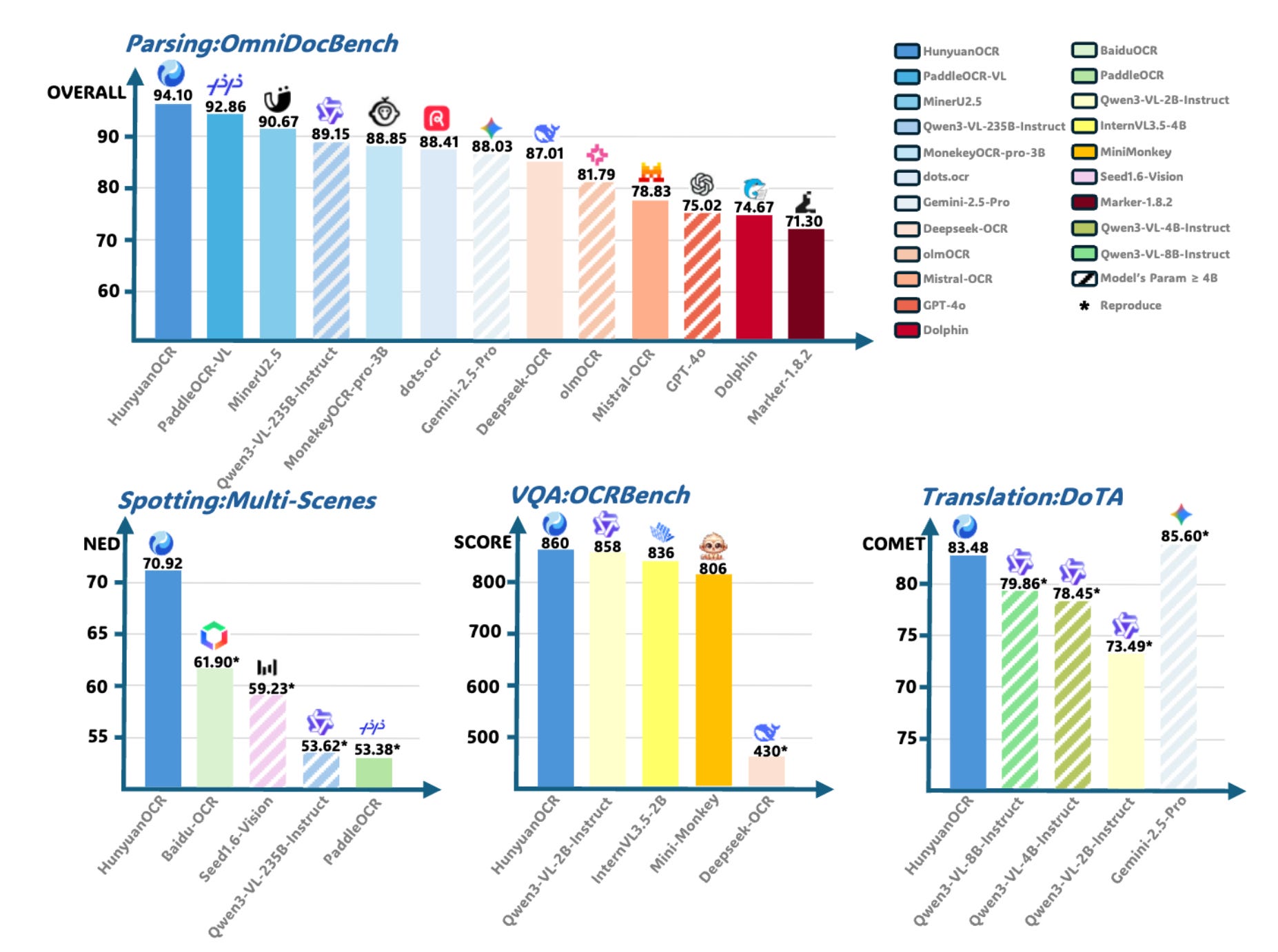 Superior benchmark performance: Won first place in ICDAR 2025 DIMT Challenge (Small Model Track), surpasses MinerU2.5 and PaddleOCR-VL on OmniDocBench for document parsing, exceeds Qwen3-VL-4B in translation and information extraction, and outperforms PaddleOCR 3.0 plus commercial Cloud OCR APIs in text spotting.