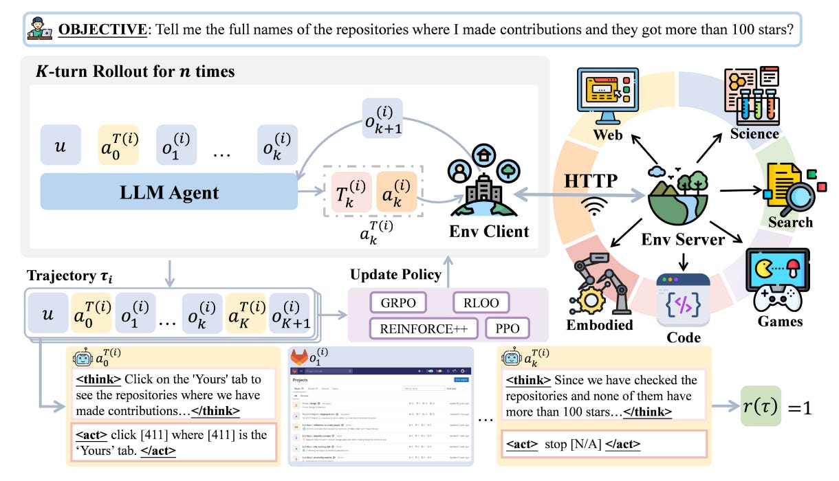 What it is: A unified, decoupled RL stack with three pluggable modules (Environment, Agent, Training) that supports PPO, GRPO, REINFORCE++, and runs across WebArena, Deep Search, TextCraft, BabyAI, and SciWorld.