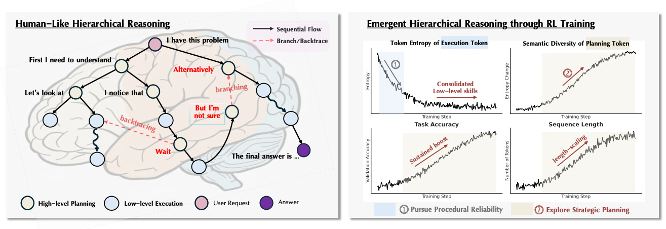 The paper argues that RL improves LLM reasoning via an emergent two-phase hierarchy: first the model firms up low-level execution, then progress hinges on exploring high-level planning. Building on this, the authors propose HICRA, which boosts credit on strategic planning tokens, and show consistent gains over GRPO. They also propose semantic entropy as a better exploration signal than token-level entropy.