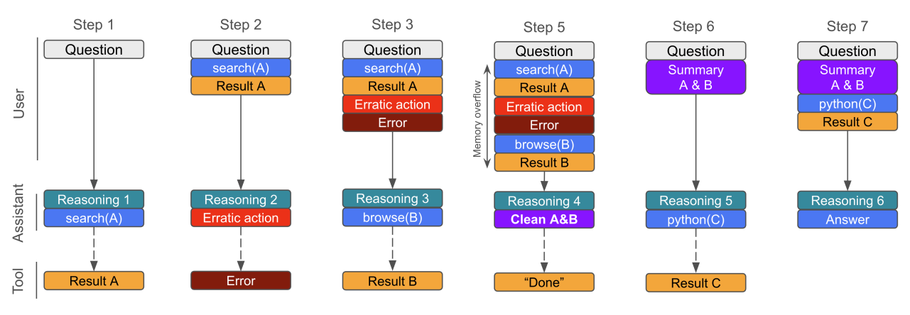 Agent design and scaffolding: Reformulates multi-turn tool use into a single, growing contextual question for QwQ and Qwen models, omitting earlier long CoTs to keep prompts stable. Adds a clean_memory tool to self-compress context when nearing limits.
