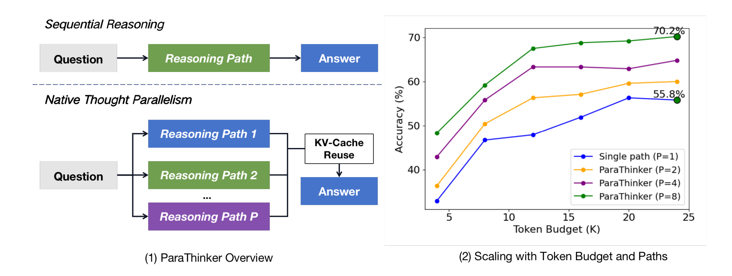 to start diverse paths, thought-specific positional embeddings to disambiguate tokens from different paths, and a two-phase attention mask that isolates paths during thinking and unifies them for summarization, reusing KV caches to avoid re-prefill.Training recipe. Supervised fine-tuning on multi-path traces sampled from teacher models, with random assignment of