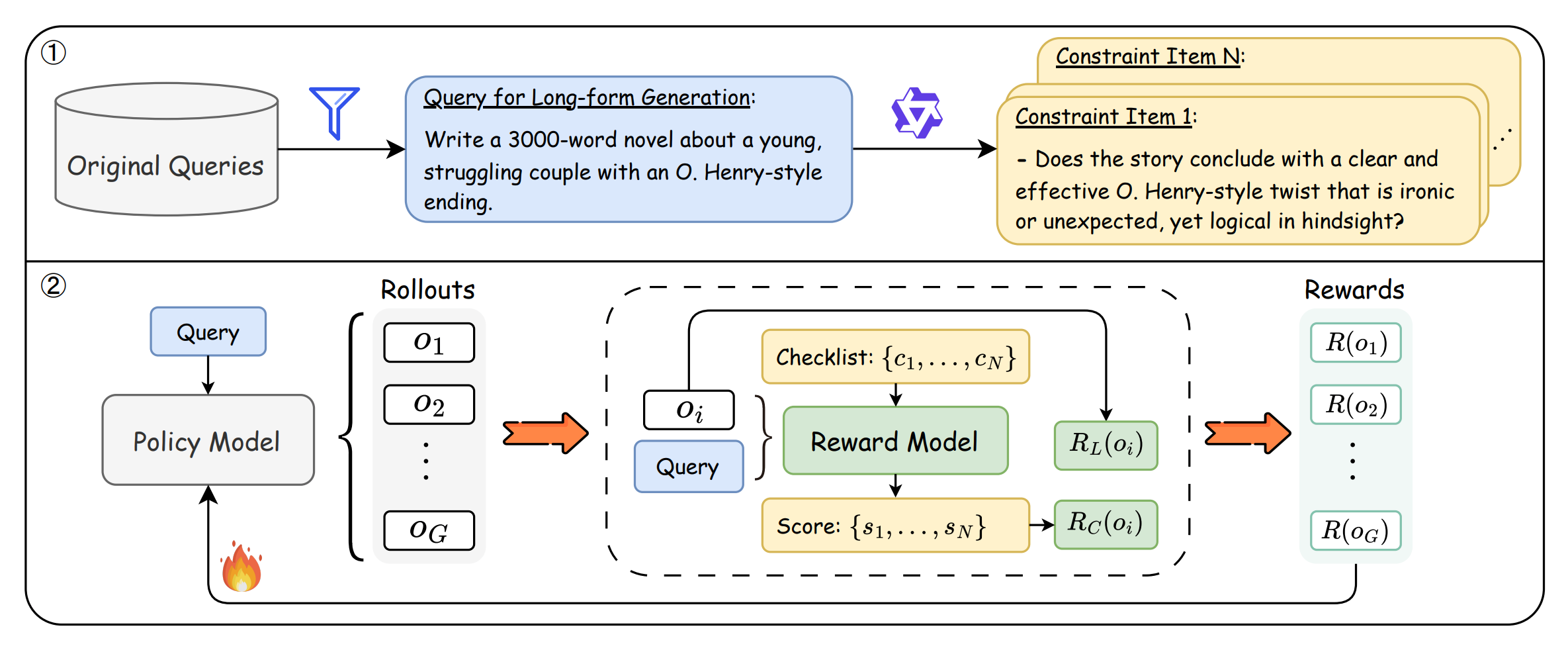 A reinforcement-learning framework that replaces coarse, preference-pair rewards with instruction-specific, verifiable checklists. ACE-RL turns each long-form task into a set of explicit and implicit constraints, scores a model’s output by how well it satisfies them, and mixes this with a length-control reward during GRPO training. The result is stronger, more controllable long-form writing across domains and styles.