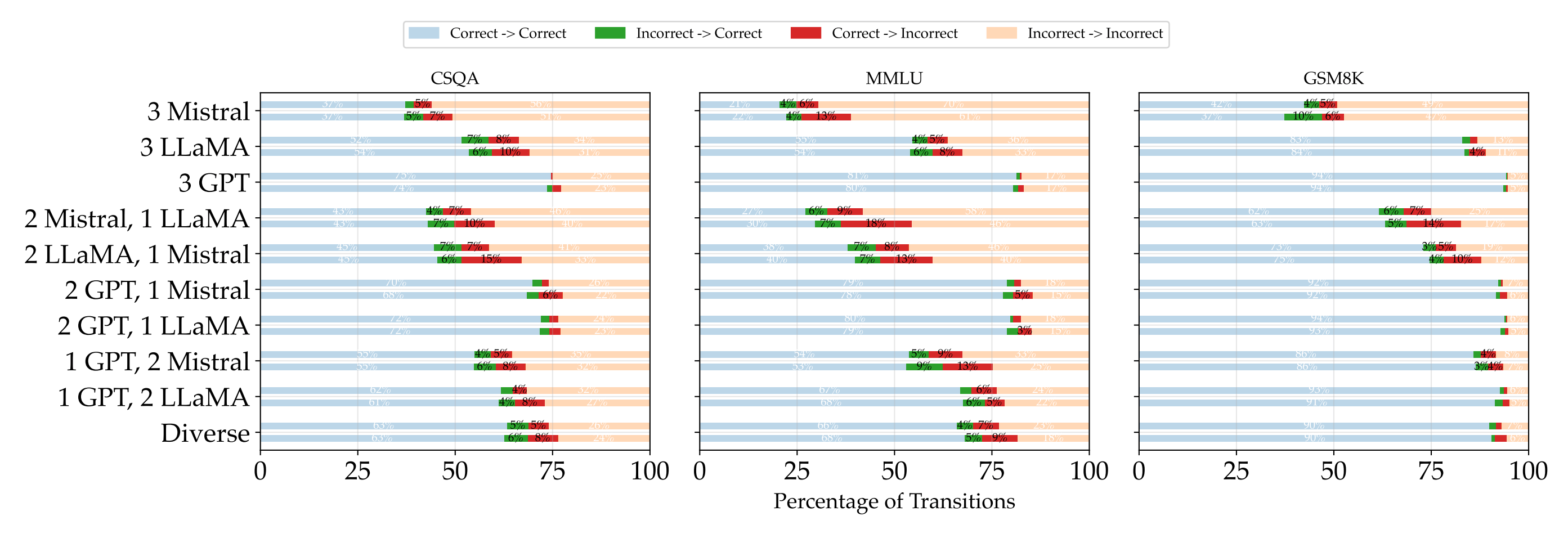 Main result. Debate frequently hurts accuracy, especially on CommonSenseQA and MMLU. They show consistent drops after debate for many groups, including mixed-capability settings: e.g., CSQA falls by 6.6 points for 1×GPT + 2×Llama and by 8.0 points for 2×Llama + 1×Mistral; MMLU drops by 12.0 points for 1×GPT + 2×Llama. GSM8K is more mixed, with small gains in some settings.
