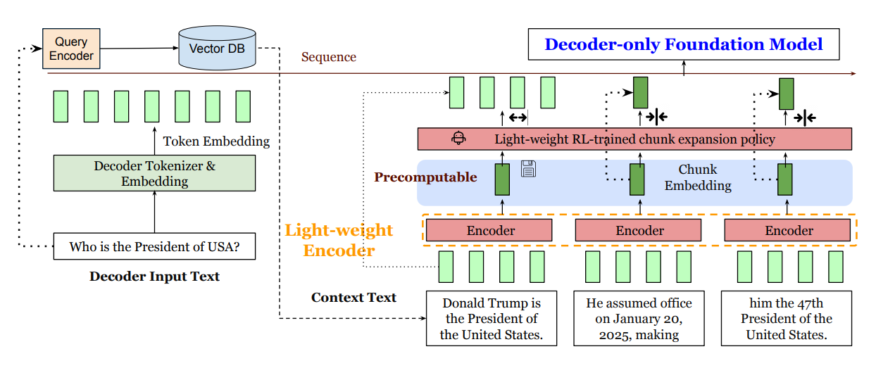 Core idea: Chunk the retrieved context, encode each chunk with a lightweight encoder, project to the decoder’s embedding size, and feed embeddings directly alongside the user query; an RL policy decides which chunks to keep uncompressed (“compress anywhere,” not only in the prefix).