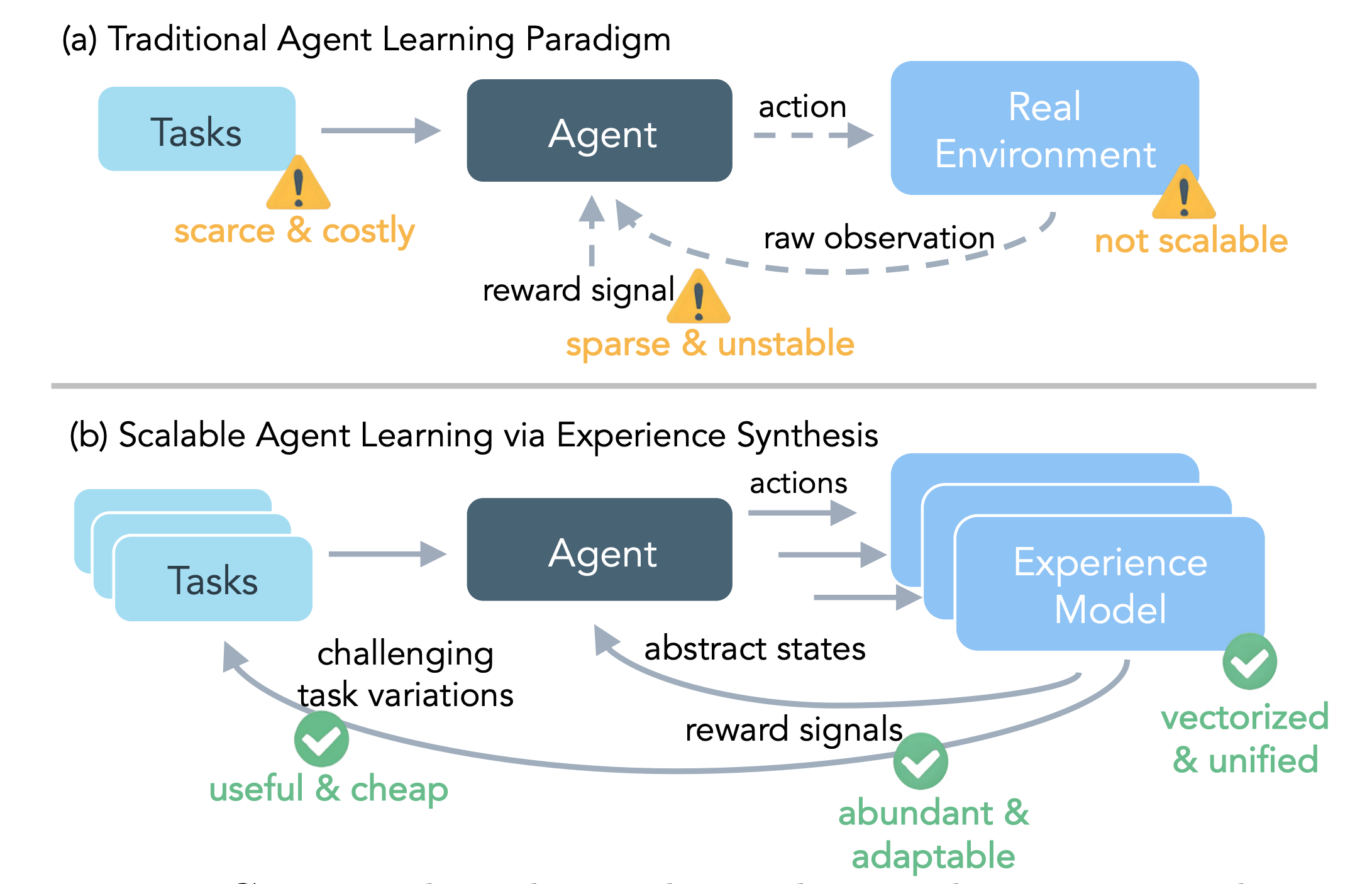 Reasoning-based experience model: Distills environment dynamics into a textual state space, predicting transitions through chain-of-thought reasoning, enabling scalable rollout collection without pixel-perfect simulation.