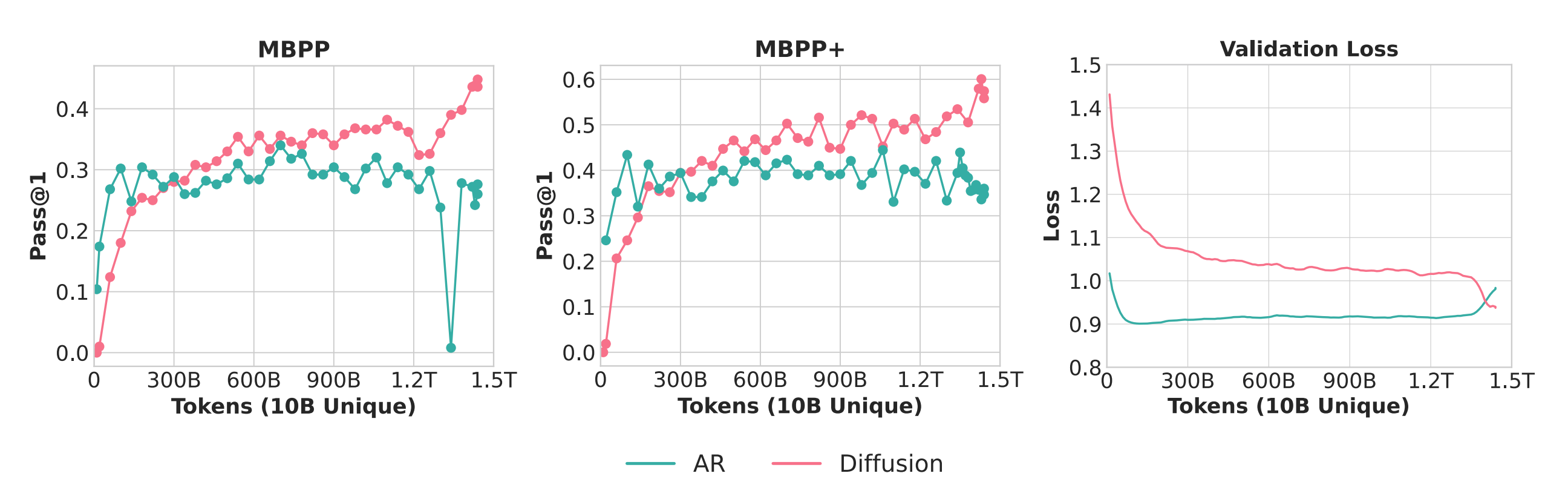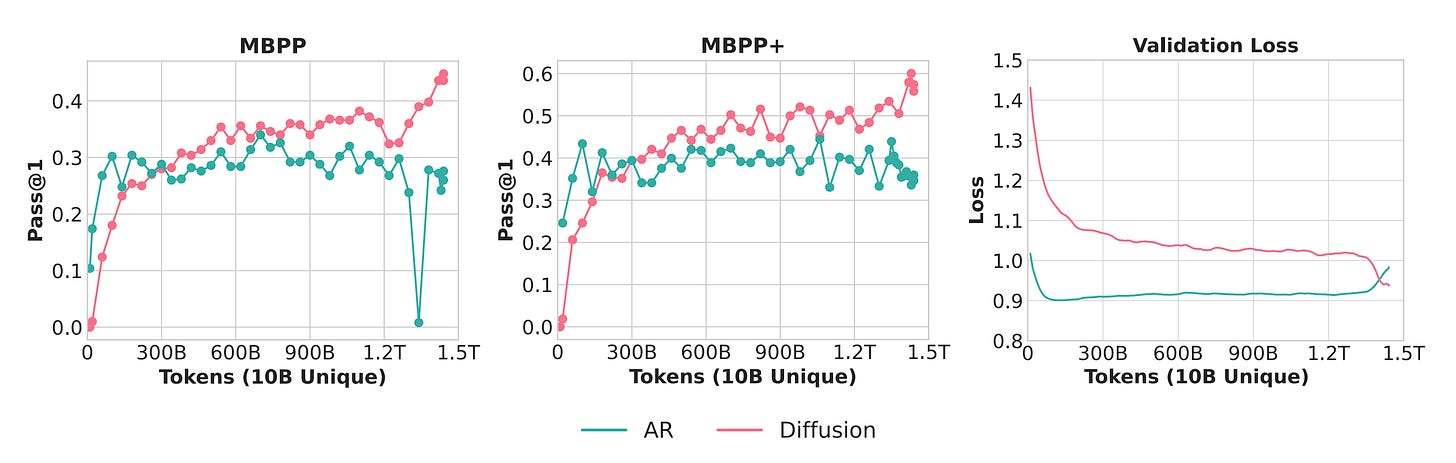 Dramatic efficiency at scale: 1.7B DLM on 10B Python tokens for ~150 epochs (1.5T total) surpasses AR baseline on MBPP/MBPP+. 1B DLM achieves 56% HellaSwag and 33% MMLU using only 1B tokens repeated 480 epochs.