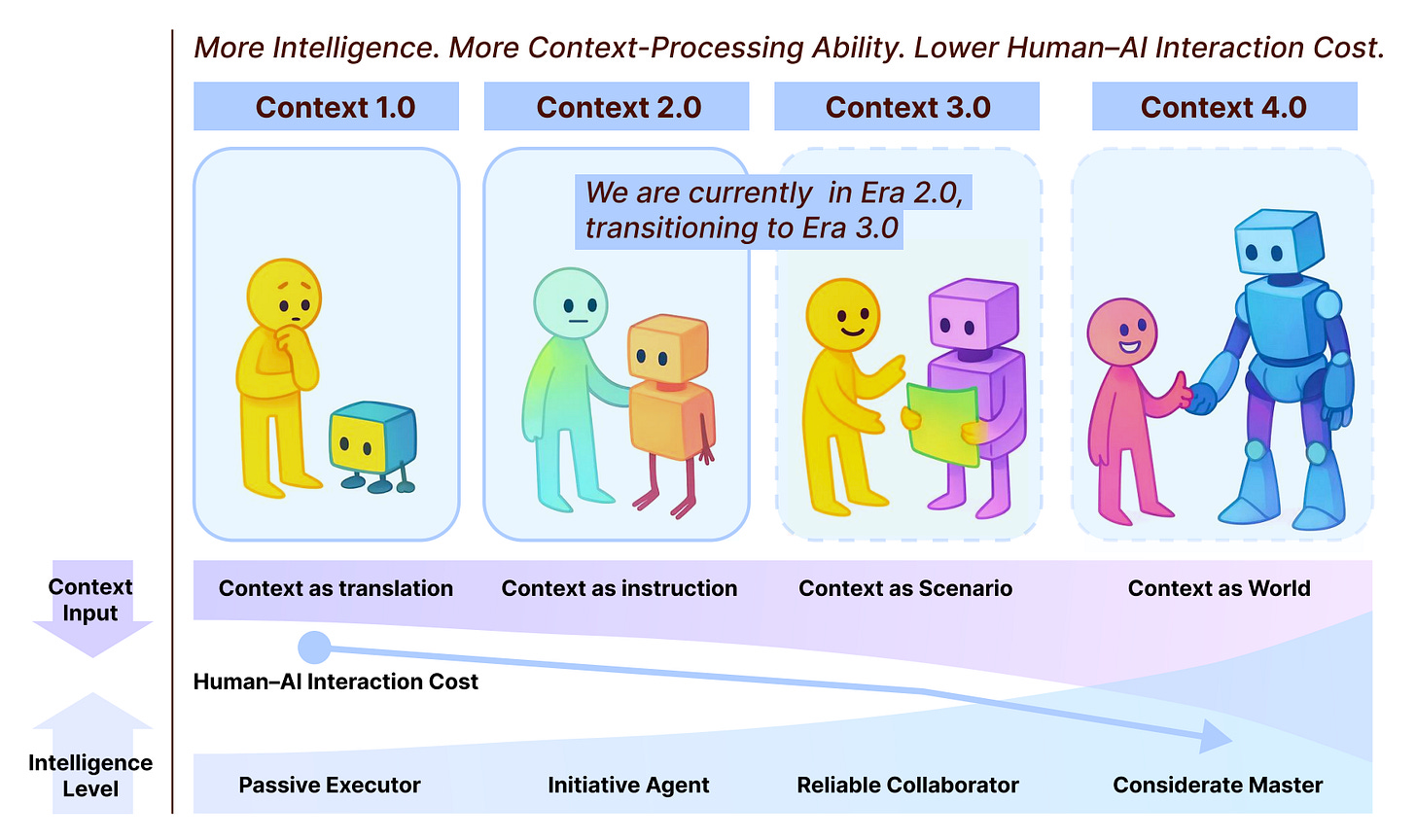Four-stage evolutionary framework: Defines Context 1.0 (1990s-2020, structured inputs like sensors and GUIs), 2.0 (2020-present, natural language via GPT-3+), 3.0 (future human-level with social cues), and 4.0 (superhuman intelligence proactively constructing context). Each stage is driven by breakthroughs that lower human-AI interaction costs.
