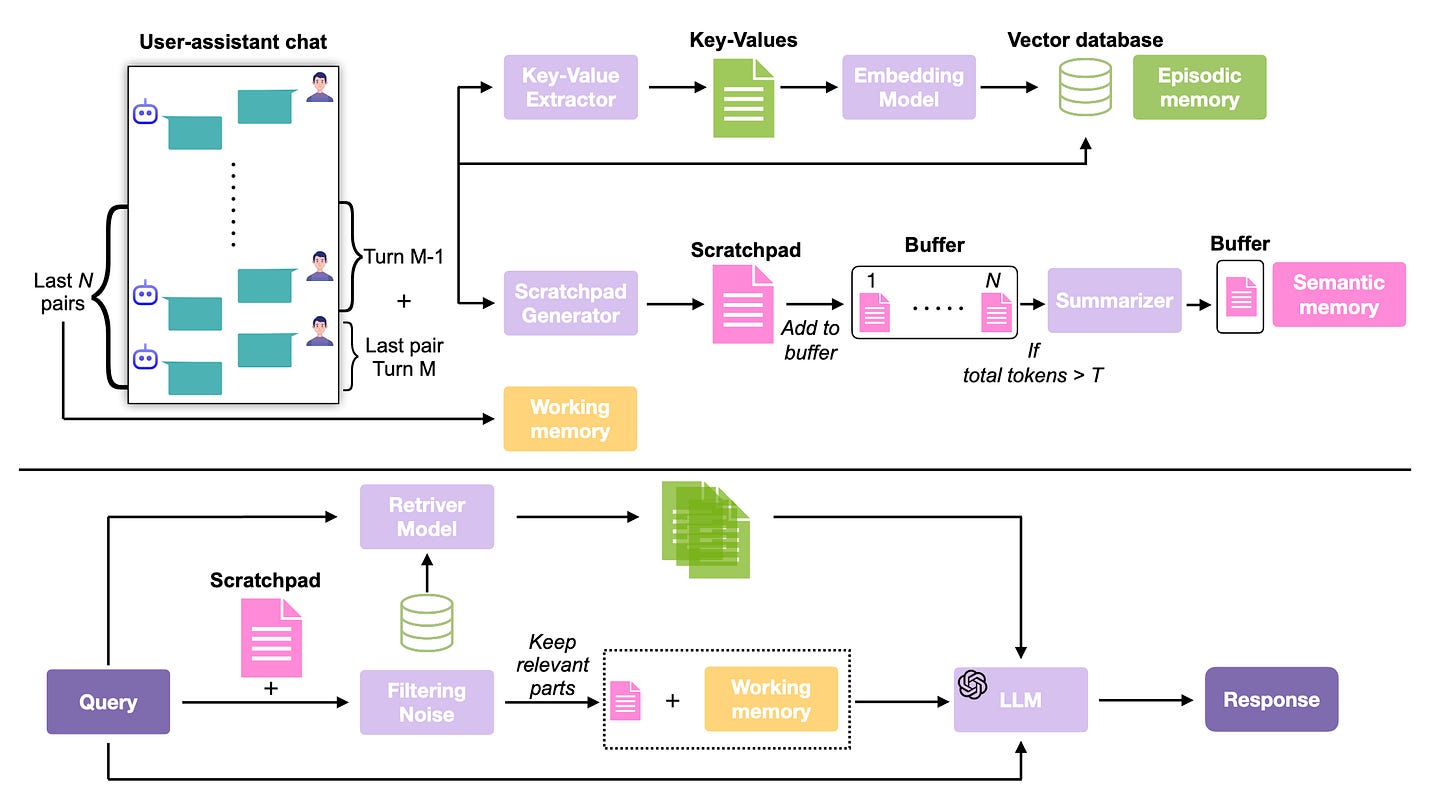 Cognitive-inspired architecture: LIGHT integrates episodic memory (retrieval-based), working memory (recent turns), and scratchpad (salient facts), mimicking human memory systems.
