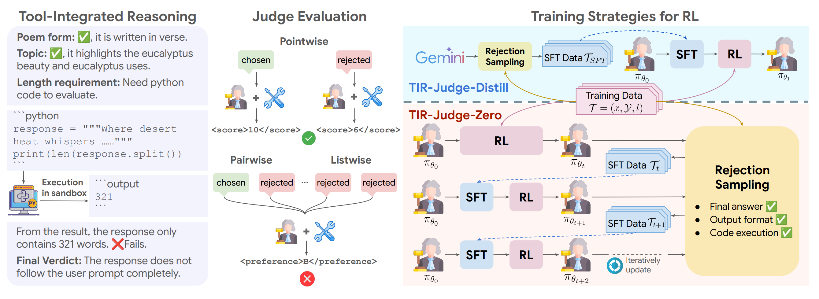 Tool-integrated reasoning: Enables judges to generate Python code, execute it, and iteratively refine reasoning during training, addressing text-only limitations on computation and symbolic reasoning tasks.