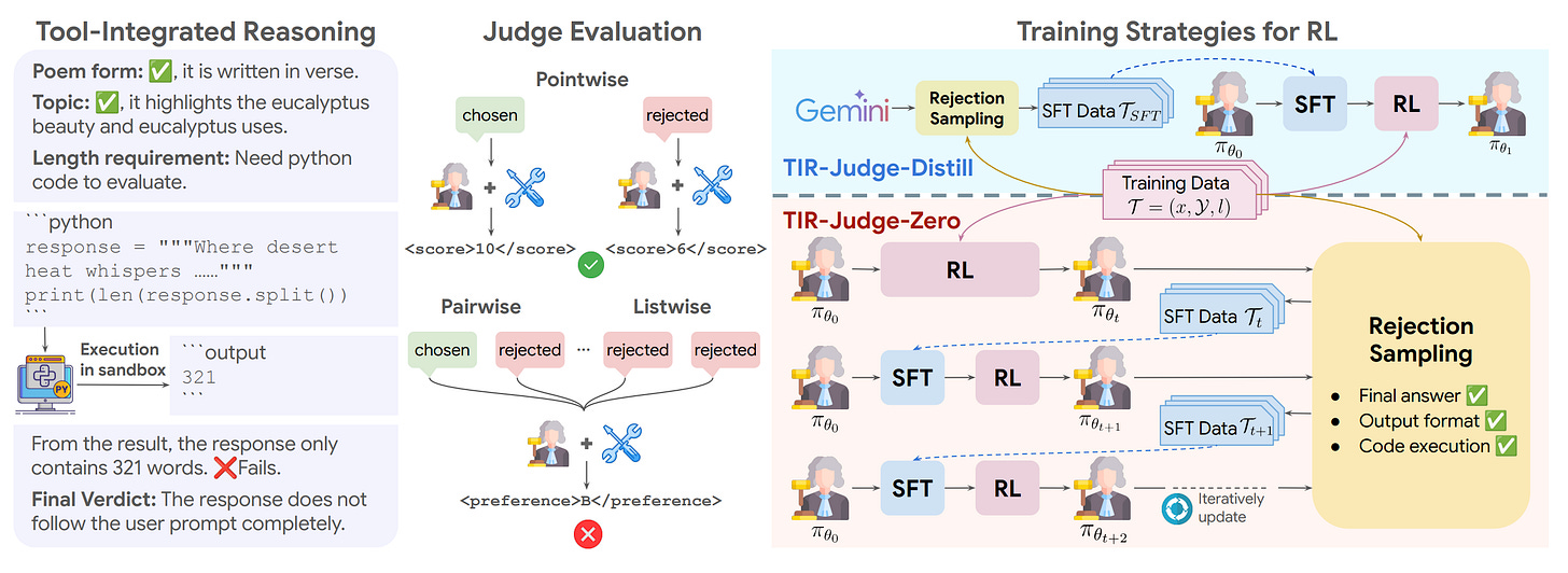 Google and collaborators introduce TIR-Judge, an end-to-end reinforcement learning framework that trains LLM judges to integrate code execution for precise evaluation. It surpasses reasoning-only judges by up to 6.4% (pointwise) and 7.7% (pairwise) while demonstrating that tool-augmented judges can self-evolve without distillation.