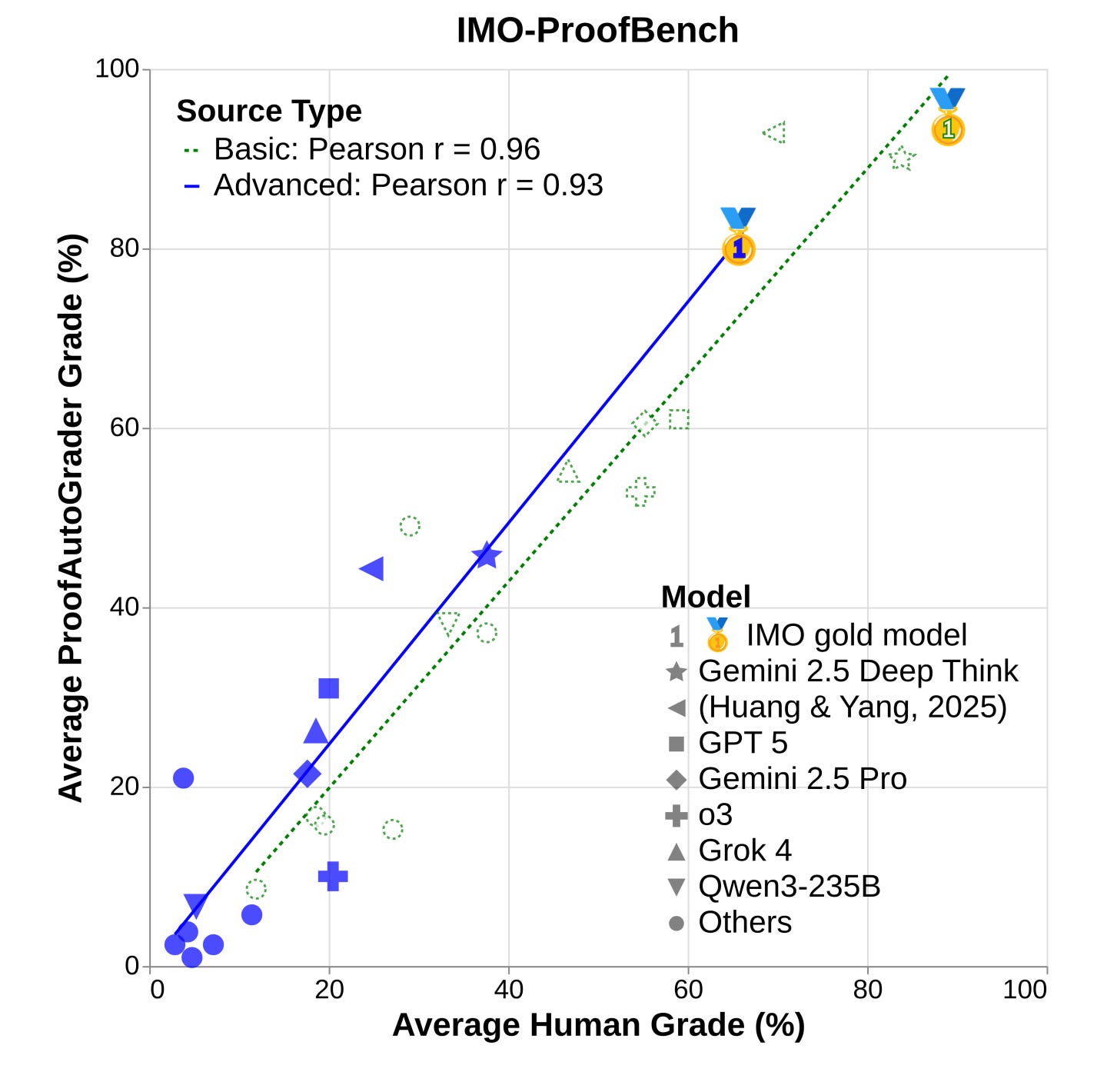 Historic IMO 2025 gold performance: Gemini Deep Think achieved 80.0% on AnswerBench (+6.9% over Grok 4, +19.2% over DeepSeek R1) and 65.7% on advanced ProofBench (+42.4% over Grok 4 heavy). Strong novel problem results (61.1%) indicate genuine capabilities.