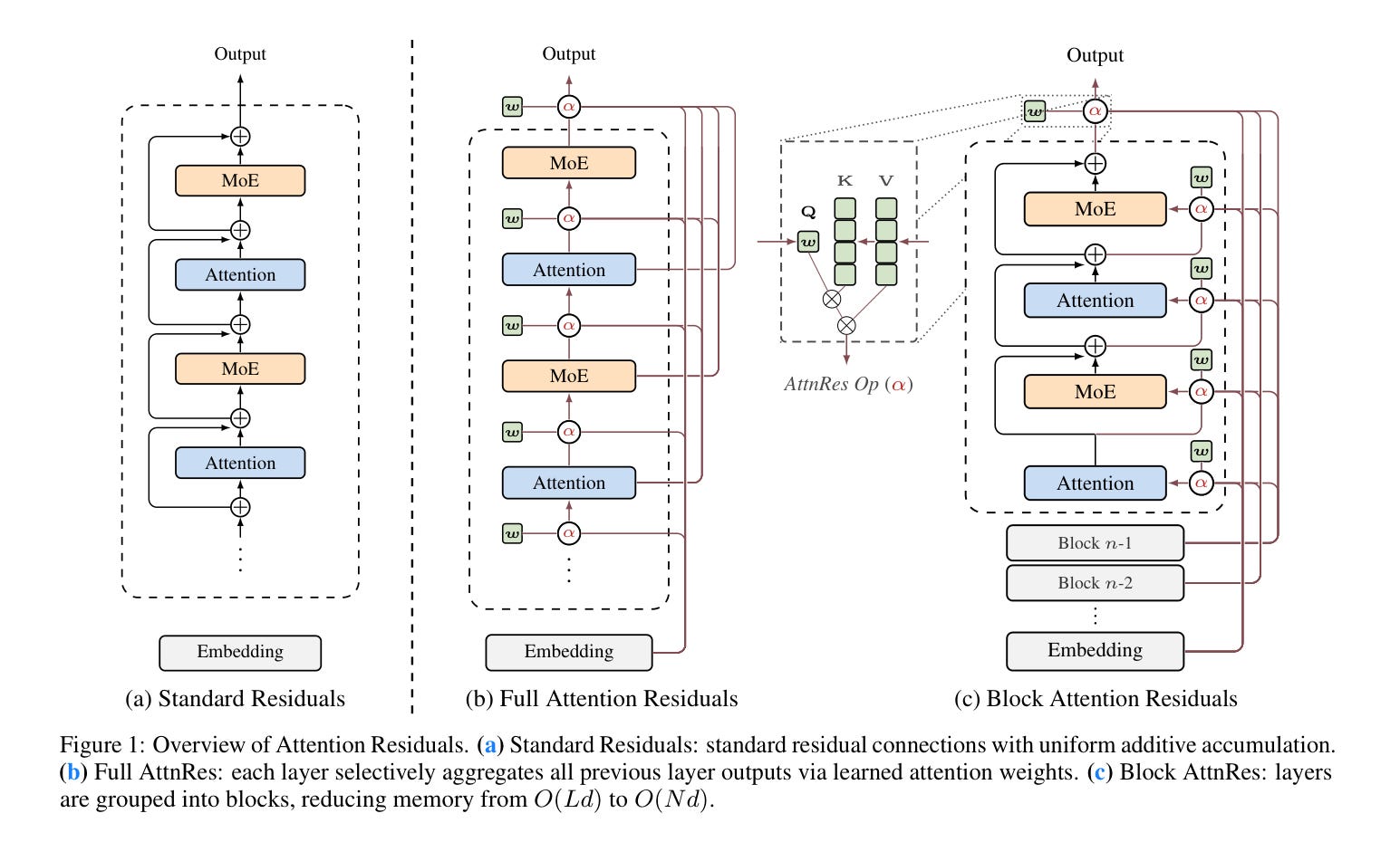 The Kimi team at Moonshot AI presents Attention Residuals (AttnRes), a technique that replaces fixed unit-weight residual connections in Transformers with softmax attention over preceding layer outputs. Residual connections with PreNorm are standard in modern LLMs, yet they accumulate all layer outputs with fixed unit weights, causing uncontrolled hidden-state growth with depth that progressively dilutes each layer’s contribution.