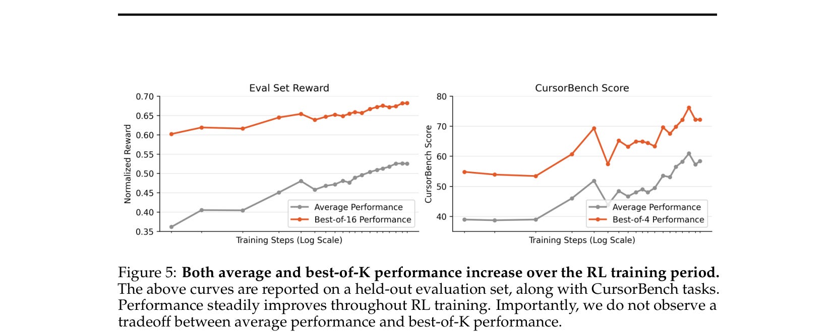 Frontier-level performance: On public benchmarks, the model scores 61.7 on Terminal-Bench and 73.7 on SWE-bench Multilingual in Cursor’s harness, comparable to state-of-the-art systems. The report demonstrates that domain-specialized training with RL can produce models competitive with much larger general-purpose systems.