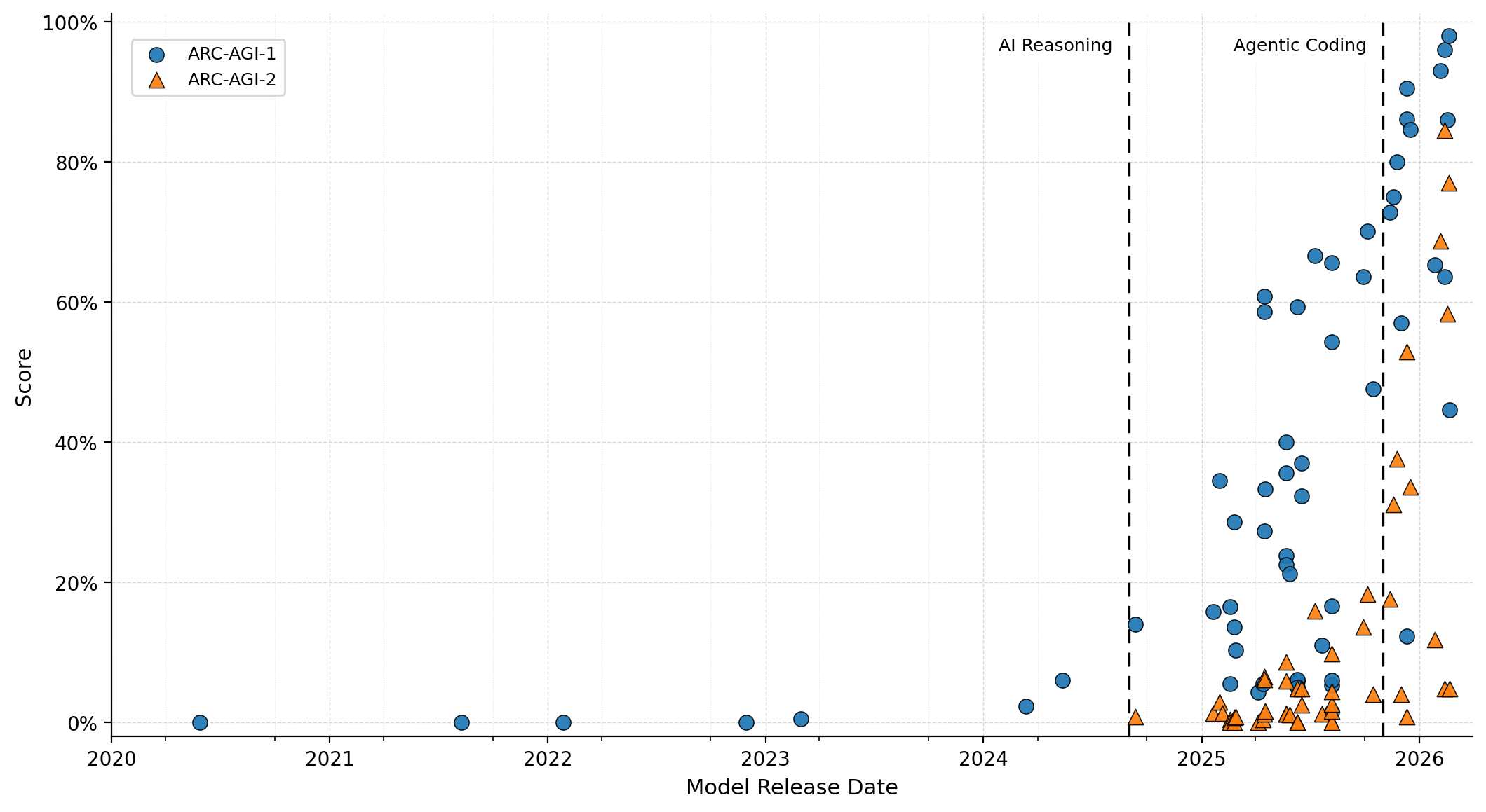 Massive human-AI gap: Humans can solve 100% of the environments while frontier AI systems score below 1%. For comparison, systems reach 93% on ARC-AGI-1 and 68.8% on ARC-AGI-2, but performance collapses on ARC-AGI-3. This gap demonstrates that current systems lack the fluid adaptive efficiency that humans exhibit on genuinely novel tasks.