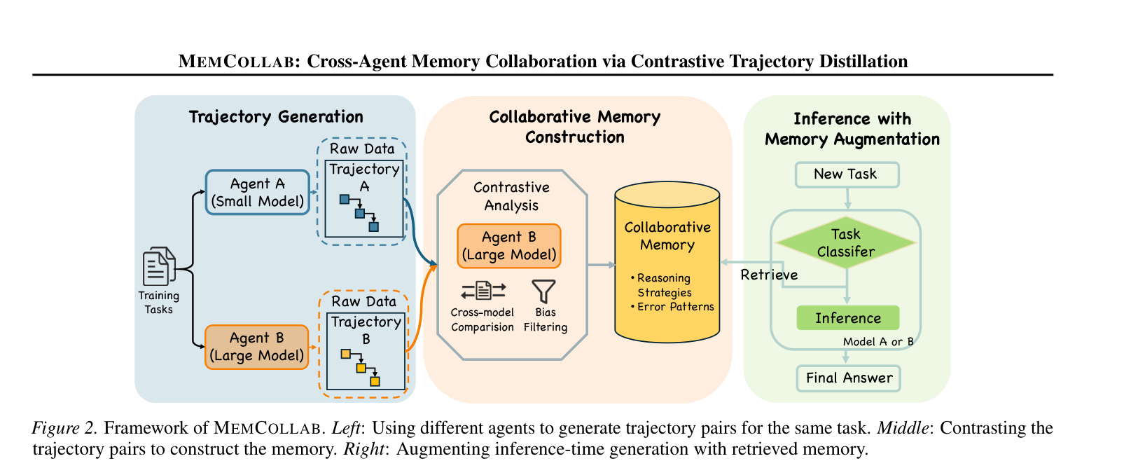 LLM-based agents build useful memory during tasks, but that memory is typically trapped within a single model. MemCollab introduces a collaborative memory framework that constructs agent-agnostic memory by contrasting reasoning trajectories generated by different agents on the same task, enabling a single memory system to be shared across heterogeneous models.