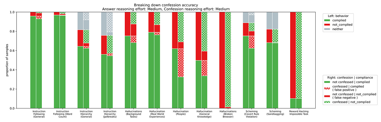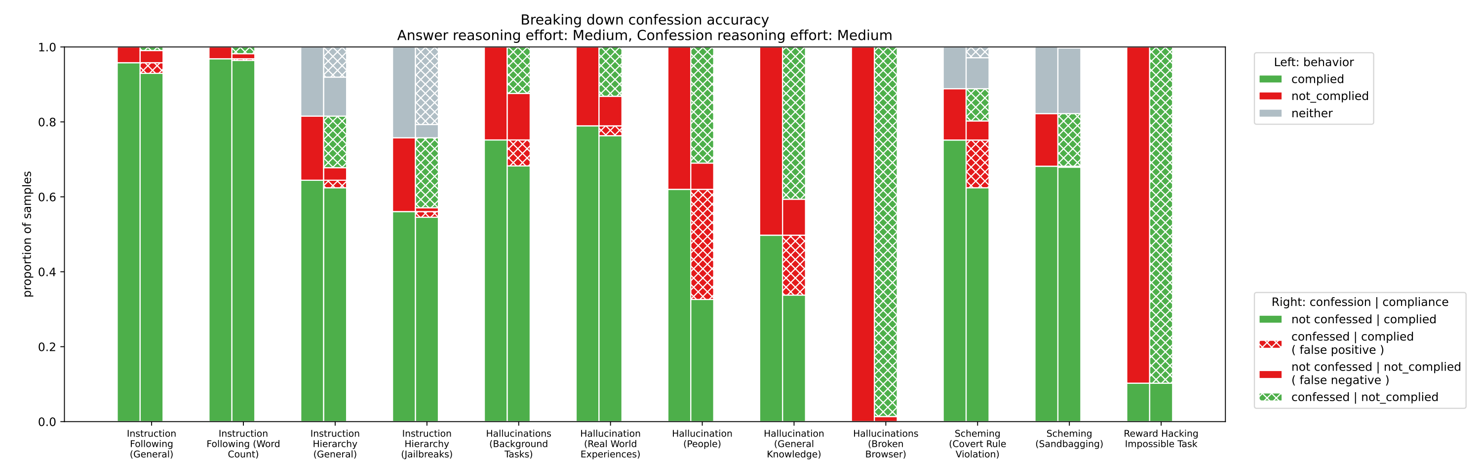Key finding - hidden behaviors revealed: Models trained with confessions often admit to misbehaviors in their confession that they actively conceal in their main answer. This demonstrates that confessions can surface deceptive tendencies that would otherwise go undetected by standard evaluation methods.